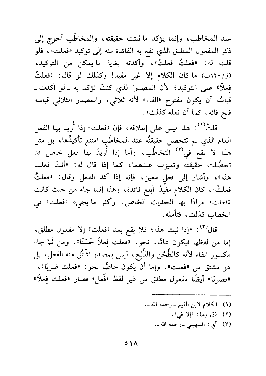 عند المخاطب، وإنما يؤكد ما ثبتت حقيقته، والمخاطَب أحوج إلى ذكر المفعول المطلق الذي تقع به الفائدة منه إلى توكيد "فعلت"، فلو قلت له: "فعلتُ فعلتُ"، وأكدته بغاية ما يمكن من التوكيد، (ق/١٢٠ ب) ما كان الكلام إلا غير مفيد! وكذلك لو قال: "فعلتُ فِعلاً" على التوكيد؛ لأن المصدر الذي كنتَ تؤكد به -لو أكدت- قياسُه أن يكون مفتوح "الفاء" لأنه ثلاثي، والمصدر الثلاثي قياسه فتح فائه، كما أن فعله كذلك".
