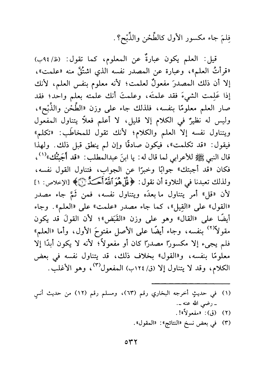 قيل: العلم يكون عبارةٌ عن المعلوم، كما تقول: "قرأتُ العلم"، وعبارة عن المصدر نفسه الذي اشتُقَّ منه "علمت"، إلا أن ذلك المصدرَ مفعولٌ لعلمت؛ لأنه معلوم بنفس العلم، لأنك إذا عَلِمت الشيءَ فقدْ علمته، وعلمتَ أنك علمته بعلم واحد؛ فقد صار العلم معلوما بنفسه، فلذلك جاء على وزن "الطِّحْن والذبْح"، وليس له نظير في الكلام إلا قليل، لا أعلم فعلا يتناول المفعول ويتناول نفسه إلا العلم والكلام؛ لأنك تقول للمخاطَب: "تكلم" فيقول: "قد تكلمت"، فيكون صادقًا وإن لم ينطق قبل ذلك. ولهذا قال النبي - صلى الله عليه وسلم - للأعرابي لما قال له: يا ابنَ عبد المطلب: "قد أجَبْتك" (¬١)، فكان "قد أجبتك" جوابا وخبرا عن الجواب، فتناول القول نفسه؛ ولذلك تعبدنا في التلاوة أن نقول: {قُلْ هُوَ اللَّهُ أَحَدٌ (١)} [الإخلاص: ١] لأن "قل" أمر يتناول ما بعدَه ويتناول نفسه، فمن ثمَّ جاء مصدر "القول" على "القِيل"، كما جاء مصدر "علمت" على "العلم". وجاء أيضًا على "القال" وهو على وزن "القَبَض"؛ لأن القولَ قد يكون مقولاً (¬٢) بنفسه، وجاء أيضًا على الأصل مفتوحَ الأول، وأما "العلم" فلم يجئ إلا مكسورًا مصدرا كان أو مفعولاً؛ لأنه لا يكون أبدًا إلا معلومًا بنفسه، و"القول" بخلاف ذلك، قد يتناول نفسه في بعض الكلام، وقد لا يتناول إلا المفعول (¬٣)، وهو الأغلب.