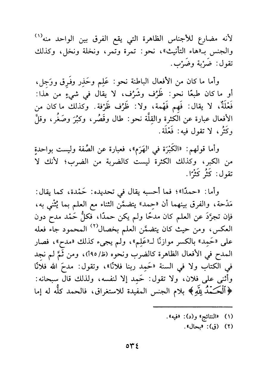 وأما: "حمدًا"؛ فما أحسبه يقال في تحديده: حَمْدة، كما يقال: مَدْحة، والفرق بينهما أن "حِمد" يتضمَّن الثناء مع العلم بما يثني به، فإن تجردَ عن العلم كان مدحًا ولم يكن حمدًا، فكلُّ حَمْد فدح دون العكس، ومن حيث كان يتضمَّن العلم بخصال (¬٢) المحمود جاء فعله على "حَمِد" بالكسر موازنَا لـ "علم"، ولم يجئ كذلك "مدح"، فصار المدح في الأفعال الظاهرة كالضرب ونحوه (ظ /١٩٥)، ومن ثَمَّ لم نجد في الكتاب ولا في السنة "حَمِد ربنا فلانًا"، وتقول: مدحَ الله فلانًا وأثنى علي فلان، ولا: تقول: حَمِد إلا لنفسه، ولذلك قال سبحانه: {الْحَمْدُ لِلَّهِ} بلام الجنس المفيدة للاستغراق، فالحمد كلُّه له إما