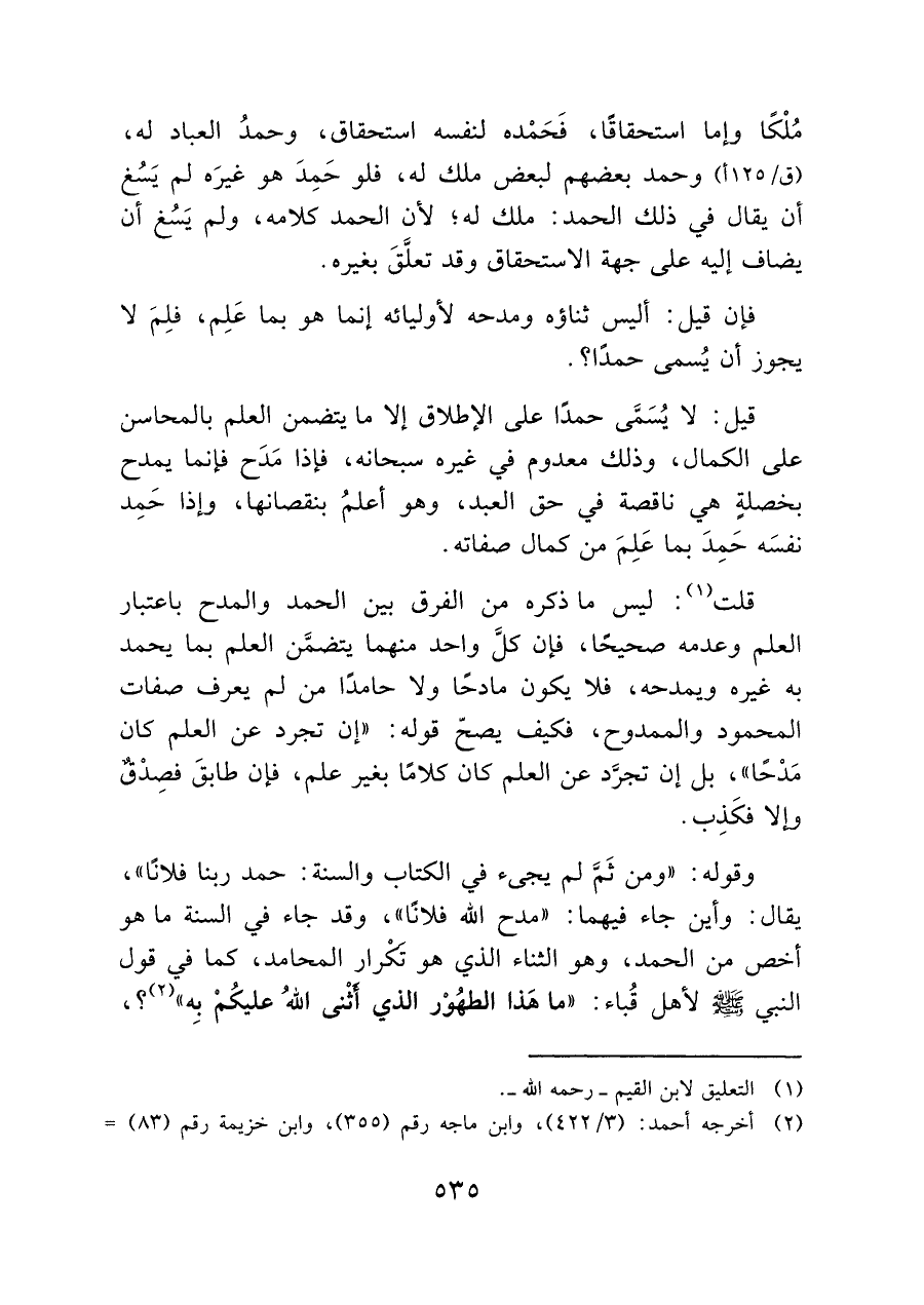 وقول: "ومن ثَمَّ لم يجئ في الكتاب والسنة: حمد ربنا فلانًا"، يقال: وأين جاء فيهما: "مدح الله فلانًا"، وقد جاء في السنة ما هو أخص من الحمد، وهو الثناء الذي هو تكرار المحامد، كما في قول النبي - صلى الله عليه وسلم - لأهل قباء: "ما هَذا الطهوْر الذي أَثْنى الله عليكمْ بِه " (¬٢)؟،