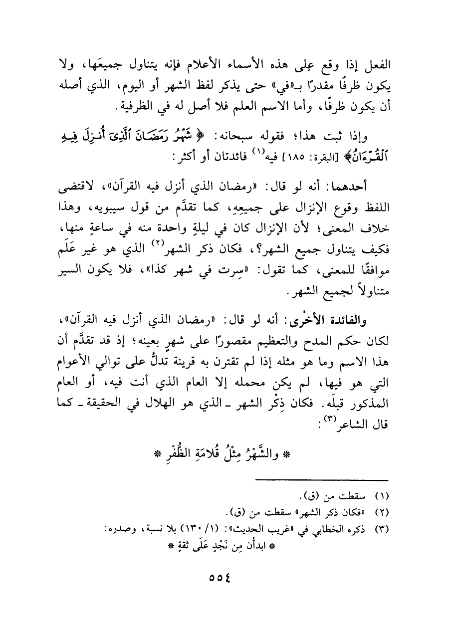 الفعل إذا وقع على هذه الأسماء الأعلام فإنه يتناول جميعَها، ولا يكون ظرفا مقدرًا بـ "في" حتى يذكر لفظ الشهر أو اليوم، الذي أصله أن يكون ظرفا، وأما الاسم العلم فلا أصل له في الظرفية.