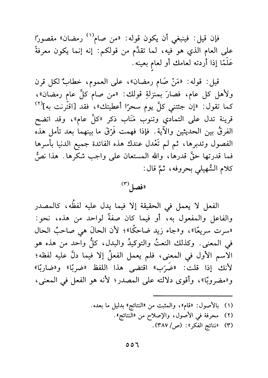 قيل: قوله: "مَنْ صَام رمضان"، على العموم؛ خطابٌ لكل قرن ولأهل كل عام، فصار بمنزلةِ قولك: "من صام كلَّ عام رمضان"، كما تقول: "إن جئتني كلَّ يوم سحرا أعطيتك"، فقد [اقترنت به] (¬٢) قرينة تدل على التمادي وتنوب مَنَاب ذكر "كلِّ عام"؛ وقد اتضح الفرقُ بين الحديثين والآية. فإذا فهمت فَرْقَ ما بينهما بعد تأمل هذه الفصول وتدبرها، ثم لم تَعْدل عندك هذه الفائدة جميع الدنيا بأسرها فما قدرتها حقَّ قدرها، والله المستعان على واجب شكرها. هذا نص كلام السُّهيلي بحروفه، ثمَّ قال: