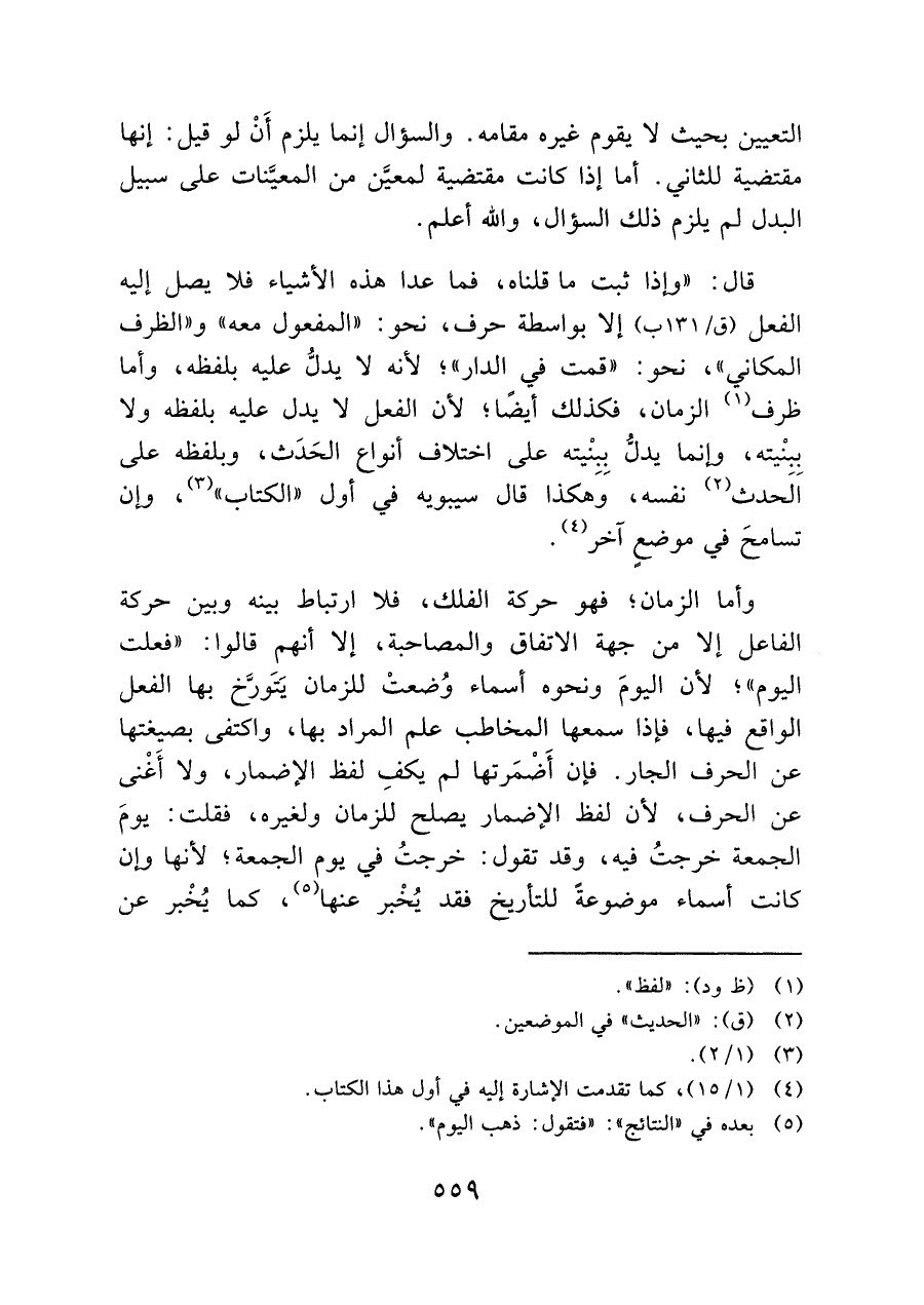 قال: "وإذا ثبت ما قلناه، فما عدا هذه الأشياء فلا يصل إليه الفعل (ق/ ١٣١ ب) إلا بواسطة حرف، نحو: "المفعول معه" و"الظرف المكاني"، نحو: "قمت في الدار"؛ لأنه لا يدلُّ عليه بلفظه، وأما ظرف (¬١) الزمان، فكذلك أيضا؛ لأن الفعل لا يدل عليه بلفظه ولا بِبِنْيته، وإنما يدلُّ بِبِنْيته على اختلاف أنواع الحَدَث، وبلفظه على الحدث (¬٢) نفسه، وهكذا قال سيبويه في أول "الكتاب" (¬٣)، وإن تسامحَ في موضعٍ آخر (¬٤).