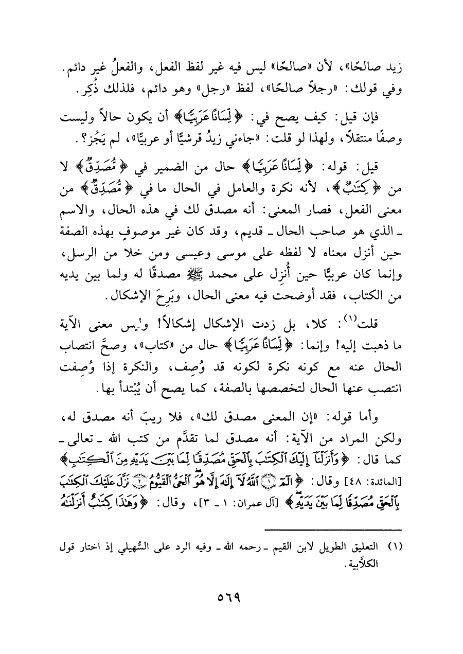 قيل: قوله: {لِسَانًا عَرَبِيًّا} حال من الضمير في {مُصَدِّقٌ} لا من {كِتَابٌ}، لأنه نكرة والعامل في الحال ما في {مُصَدِّقٌ} من معنى الفعل، فصار المعنى أنه مصدق لك في هذه الحال، والاسم -الذي هو صاحب الحال- قديم، وقد كان غير موصوفٍ بهذه الصفة حين أنزل معناه لا لفظه على موسى وعيسى ومن خلا من الرسل، وإنما كان عربيًّا حين أُنزِل على محمد -صلى الله عليه وسلم- مصدقًا له ولما بين يديه من الكتاب، فقد أوضحت فيه معنى الحال، وبَرِحَ الإشكال.