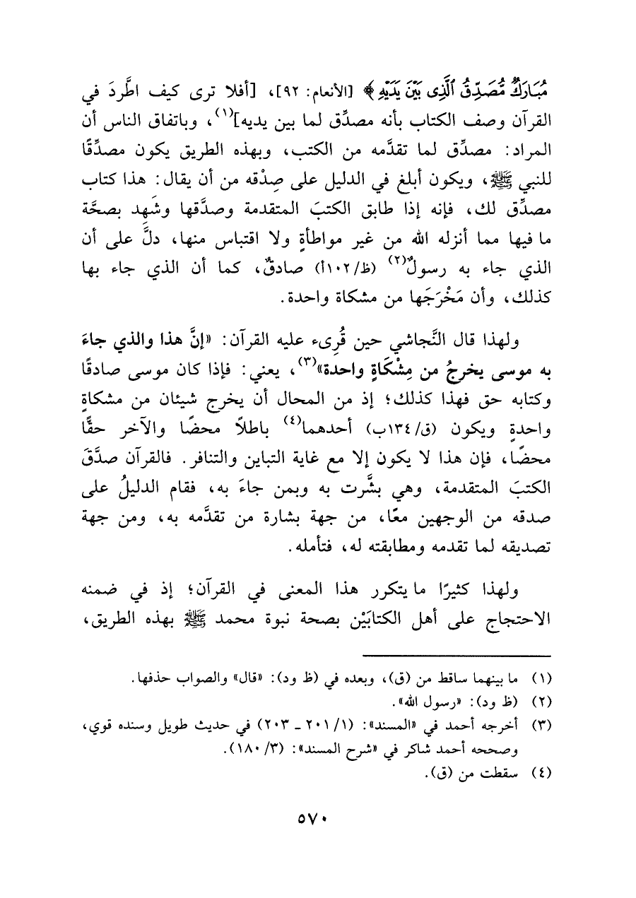 ولهدا قال النَّجاشي حين قُرِئ عليه القرآن: "إنَّ هذا والذي جاءَ به موسى يخرجُ من مِشكَاةٍ واحدة" (¬٣)، يعني: فإذا كان موسى صادقًا وكتابه حق فهذا كذلك؛ إذ من المحال أن يخرج شيئان من مشكاة واحدةٍ ويكون (ق/١٣٤ ب) أحدهما (¬٤) باطلًا محضًا والآخر حقًّا محضًا، فإن هذا لا يكون إلا مع غاية التباين والتنافر. فالقرآن صدَّقَ الكتبَ المتقدمة، وهي بشَرت به وبمن جاءَ به، فقام الدليلُ على صدقه من الوجهين معًا، من جهة بشارة من تقدَّمه به، ومن جهة تصديقه لما تقدمه ومطابقته له، فتأمله.