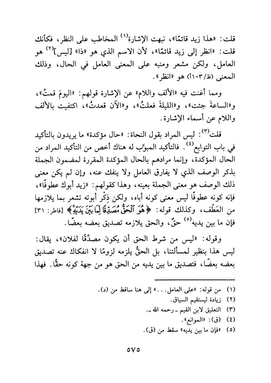 قلت (¬٣): ليس المراد بقول النحاة: "حال مؤكدة" ما يريدون بالتأكيد في باب التوابع (¬٤). فالتأكيد المبوَّب له هناك أخص من التأكيد المراد من الحال المؤكدة، وإنما مرادهم بالحال المؤكدة المقررة لمضمون الجملة بذكر الوصف الذي لا يفارق العامل ولا ينفك عنه، وإن لم يكن معنى ذلك الوصف هو معنى الجملة بعينه، وهذا كقولهم: "زيد أبوك عطوفاً"، فإنه كونه عطوفاً ليس معنى كونه أباه، ولكن ذِكْر أبوته تشعر بما يلازمها من العَطْف، وكذلك قوله: {هُوَ الْحَقُّ مُصَدِّقًا لِمَا بَيْنَ يَدَيْهِ} [فاطر: ٣١] فإنَّ ما لين يديه (¬٥) حقٌ، والحق يلازمه تصديق بعضه بعضًا.
