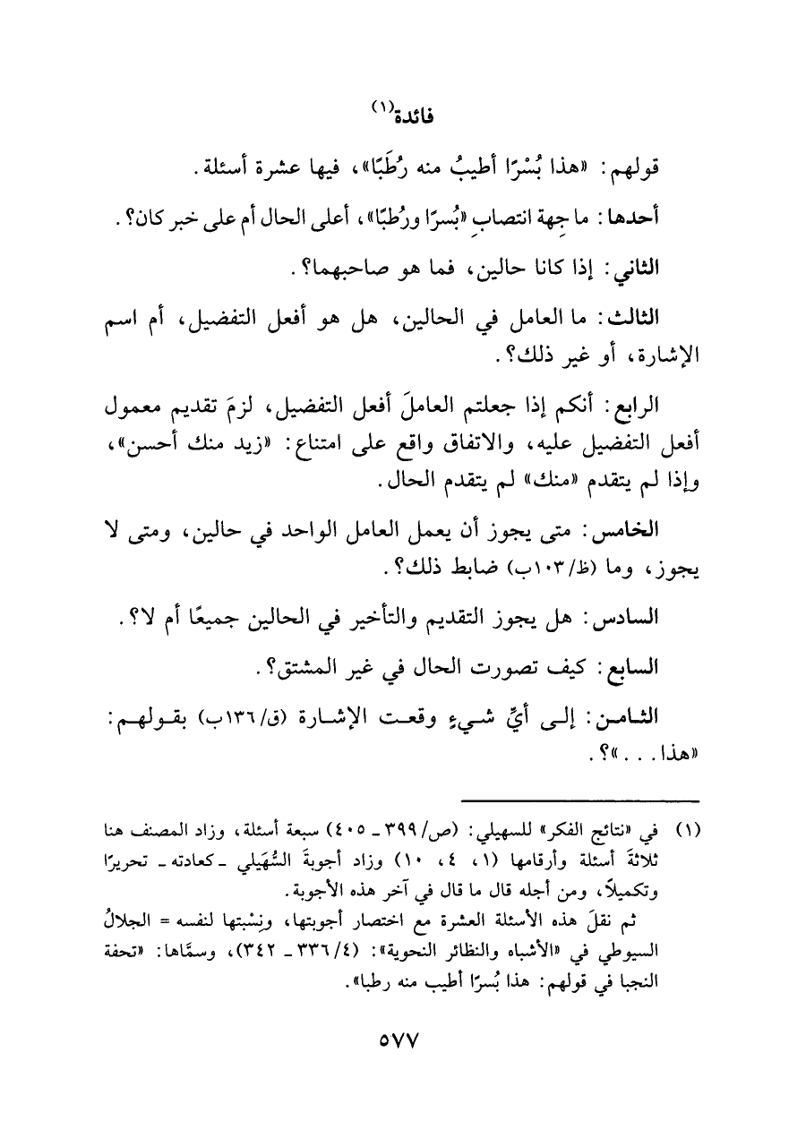 ثم نقلَ هذه الأسئلة العشرة مع اختصار أجوبتها، ونسْبتها لنفسه -الجلالُ السيوطي في "الأشباه والنظائر النحوية": (٤/ ٣٣٦ - ٣٤٢)، وسمَّاها: "تحفة النجبا في قولهم: هذا بُسرًا أطيب منه رطبا".