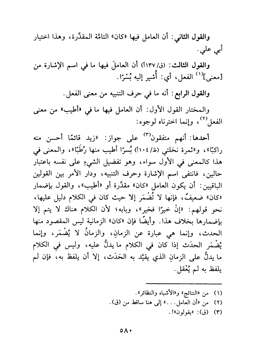 أحدها: أنهم متفقون (¬٣) على جواز: "زيد قائمًا أحسن منه راكبًا"، و"ثمرة نخلتي (ظ/ ١٠٤ أ) بُسرًا أطيب منها رُطَبًا"، والمعنى في هذا كالمعنى في الأول سواء، وهو تفضيل الشيءِ على نفسه باعتبار حالين، فانتفى اسم الإشارة وحرف التنبيه، ودار الأمر بين القولين الباقين: أن يكون العامل "كان" مقدَّرة أو "أطيب"، والقول بإضمار "كان" ضعيفٌ، فإنها لا تُضْمَر إلا حيث كان في الكلام دليل عليها، نحو قولهم: "إنْ خيرًا فخيبر"، وبابه؛ لأن الكلام هناك لا يتم إلا بإضمارها بخلاف هذا. وأيضًا فإن "كان" الزمانية ليس المقصود منها الحدث، وإنما هي عبارة عن الزمانِ، والزمانُ لا يُضْمَر، وإنما يُضْمَر الحدَث إذا كان في الكلام ما يدلُّ عليه، وليس في الكلام ما يدلُّ على الزمانٍ الذي يقيَّد به الحَدَث، إلا أن يلفظ به، فإن لم يلفظ به لم يُعْقل.