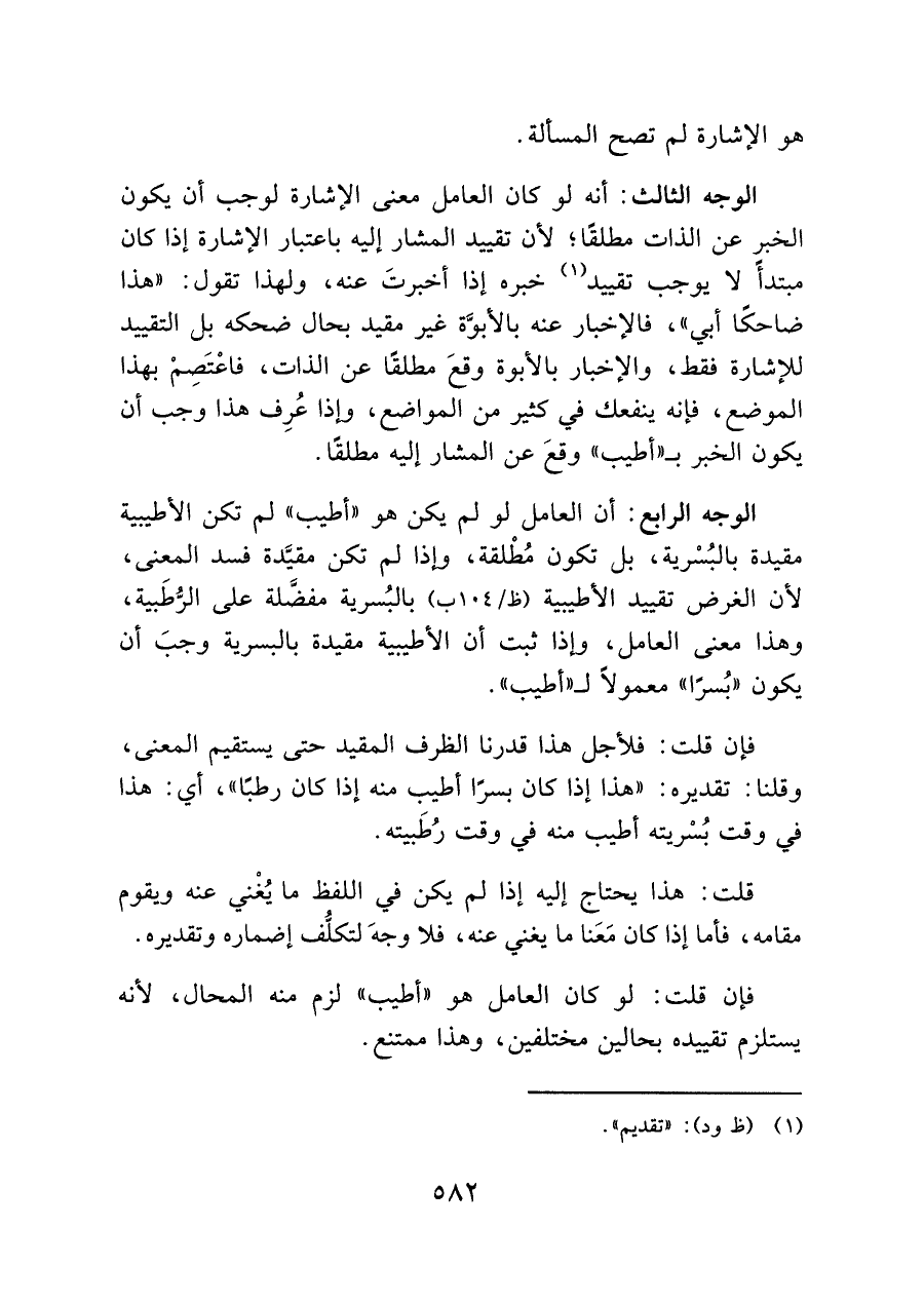 الوجه الثالث: أنه لو كان العامل معنى الإشارة لوجب أن يكون الخبر عن الذات مطلقًا؛ لأن تقييد المشار إليه باعتبار الإشارة إذا كان مبتدأً لا يوجب تقييد (¬١) خبره إذا أخبرتَ عنه، ولهذا تقول: "هذا ضاحكًا أبي"، فالإخبار عنه بالأبوَّة غير مقيد بحال ضحكه بل التقييد للإشارة فقط، والإخبار بالأبوة وقعَ مطلقًا عن الذات، فاعْتَصِمْ بهذا الموضع، فإنه ينفعك في كثير من المواضع، وإذا عُرِف هذا وجب أن يكون الخبر بـ "أطيب" وقعَ عن المشار إليه مطلقًا.