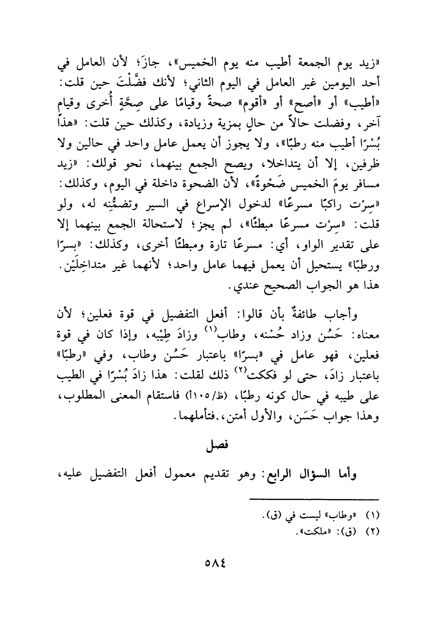 "زيد يوم الجمعة أطيب منه يوم الخميس"، جازَ؛ لأن العامل في أحد اليومين غير العامل في اليوم الثاني؛ لأنك فضَّلْتَ حين قلت: "أطيب" أو "أصح" أو "أقوم" صحةً وقيامًا على صِحَّةٍ أُخرى وقيام آخر، وفضلت حالاً من حالٍ بمزية وزيادة، وكذلك حين قلت: "هذَا بُسْرًا أطيب منه رطبًا"، ولا يجوز أن يعمل عامل واحد في حالين ولا ظرفين، إلا أن يتداخلا، ويصح الجمع بينهما، نحو قولك. "زيد مسافر يومَ الخميس ضَحْوةً"، لأن الضحوة داخلة في اليوم، وكذلك: "سِرْت راكبًا مسرعًا" لدخول الإسراع في السير وتضْمُّنِه له، ولو قلت: "سِرْت مسرعًا مبطئًا"، لم يجز؛ لاستحالة الجمع بينهما إلا على تقدير الواو، أي: مسرعًا تارة ومبطئًا أخرى، وكذلك: "بسرًا ورطبًا" يستحيل أن يعمل فيهما عامل واحد، لأنهما غير متداخِلَيْن هذا هو الجواب الصحيح عندي.