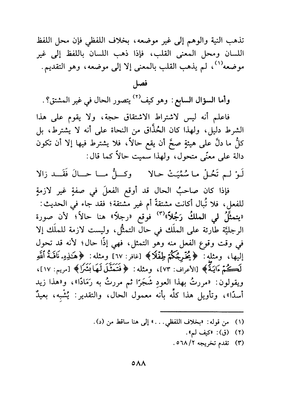 وأما السؤال السابع: وهو كيف (¬٢) يتصور الحال في غير المشتق؟.