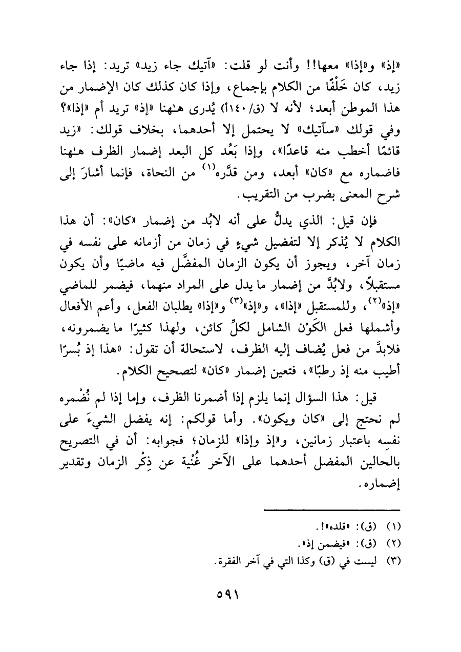 فإنَّ قيل: الذي يدلُّ على أنه لابُد من إضمار "كان": أن هذا الكلام لا يُذكر إلا لتفضيل شيءٍ في زمان من أزمانه على نفسه في زمان آخر، ويجوز أن يكون الزمان المفضَّل فيه ماضيًا وأن يكون مستقبلًا، ولابدَّ من إضمار ما يدل على المراد منهما، فيضمر للماضي "إذ" (¬٢)، وللمستقبل "إذا"، و"إذ" (¬٣) و"إذا" يطلبان الفعل، وأعم الأفعال وأشملها فعل الكَوْن الشامل لكلِّ كائن، ولهذا كثيرًا ما يضمرونه، فلابدَّ من فعل يُضاف إليه الظرف، لاستحالة أن تقول: "هذا إذ بُسرًا أطيب منه إذ رطبًا"، فتعين إضمار "كان" لتصحيح الكلام.