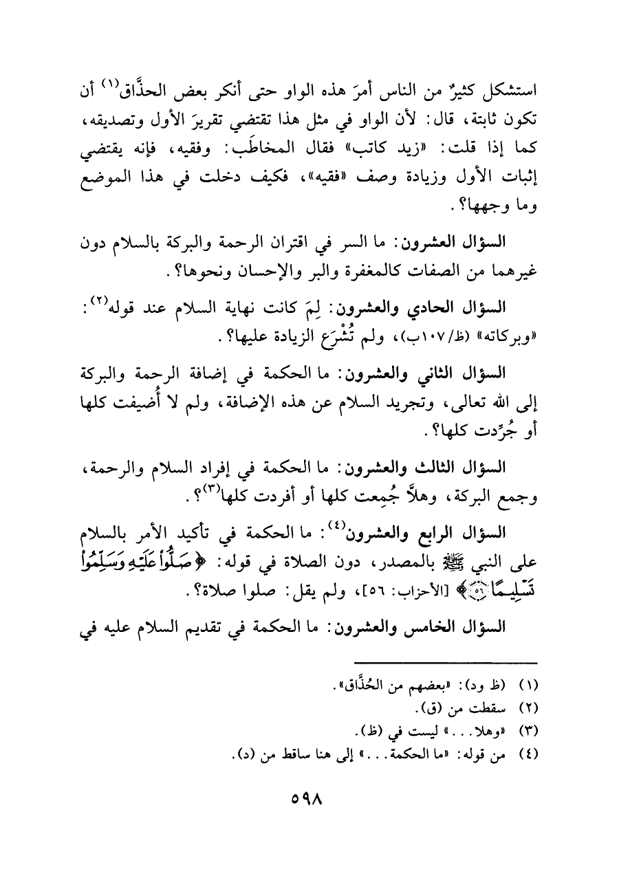السؤال الثالث والعشرون: ما الحكمة في إفراد السلام والرحمة، وجمع البركة، وهلَّا جُمِعت كلها أو أفردت كلها (¬٣)؟.