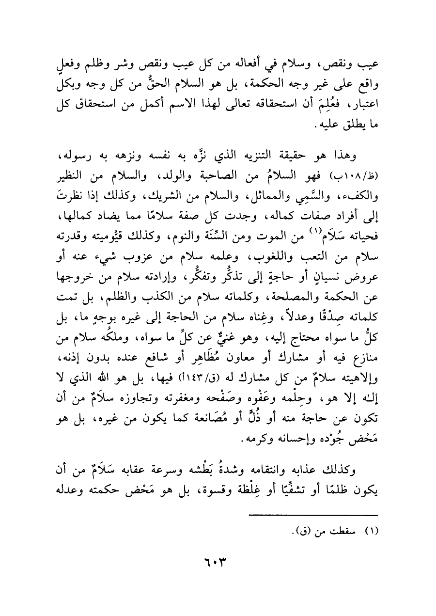 وهذا هو حقيقة التنزيه الذي نزَّه به نفسه ونزهه به رسوله، (ظ/١٠٨ ب) فهو السلامُ من الصاحبة والولد، والسلام من النظير والكفء، والسَّمِي والمماثل، والسلام من الشريك، وكذلك إذا نظرتَ إلى أفراد صفات كماله، وجدت كل صفة سلامًا مما يضاد كمالها، فحياته سَلام (¬١) من الموت ومن السِّنَة والنوم، وكذلك قيُّوميته وقدرته سلام من التعب واللغوب، وعلمه سلام من عزوب شئ عنه أو عروض نسيان أو حاجةٍ إلى تذكُّر وتفكُّر، وإرادته سلام من خروجها على الحكمة والمصلحة، وكلماته سلام من الكذب والظلم، بل تمت كلماته صِدْقًا وعدلاً، وغِناه سلام من الحاجة إلى غيره بوجهٍ ما، بل كلُّ ما سواه محتاج إليه، وهو غنيّ عن كل ما سواه، وملكُه سلام من منازع فيه أو مشارك أو معاود مُظَاهِر أو شافع عنده بدود إذنه، وإلاهيته سلام من كل مشارك له (ق/١٤٣ أ)، فيها، بل هو الله الذي لا إله إلا هو، وحِلمه وعَفْوه وصَفْحه ومغفرته وتجاوزه سلامٌ من أن تكون عن حاجة منه أو ذُلٍّ أو مُصَانعة كما يكون من غيره، بل هو مَحْض جُوْده وإحسانه وكرمه.