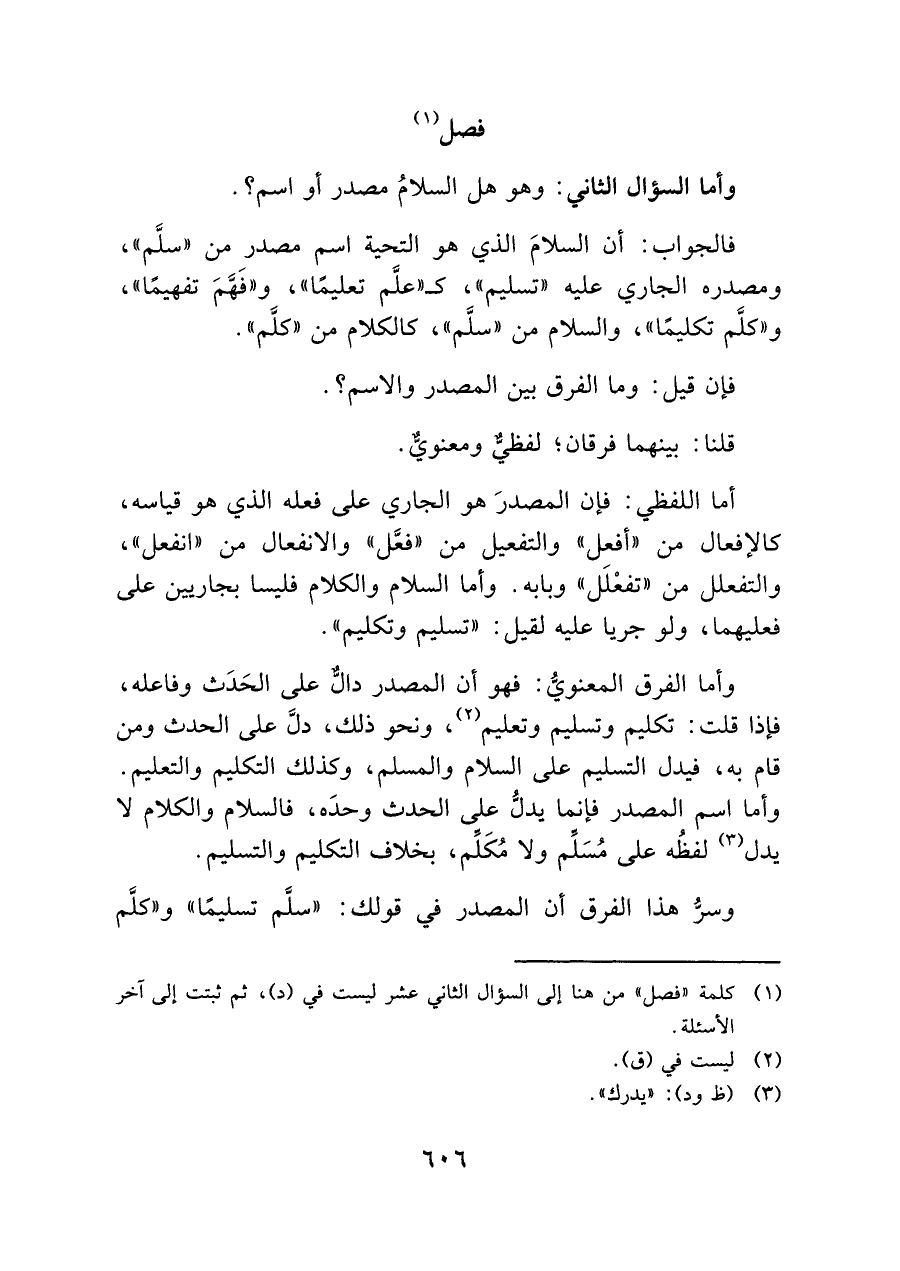 (¬١) كلمة "فصل" من هنا إلى السؤال الثاني عشر ليست في (د)، ثم ثبتت إلى آخر الأسئلة.