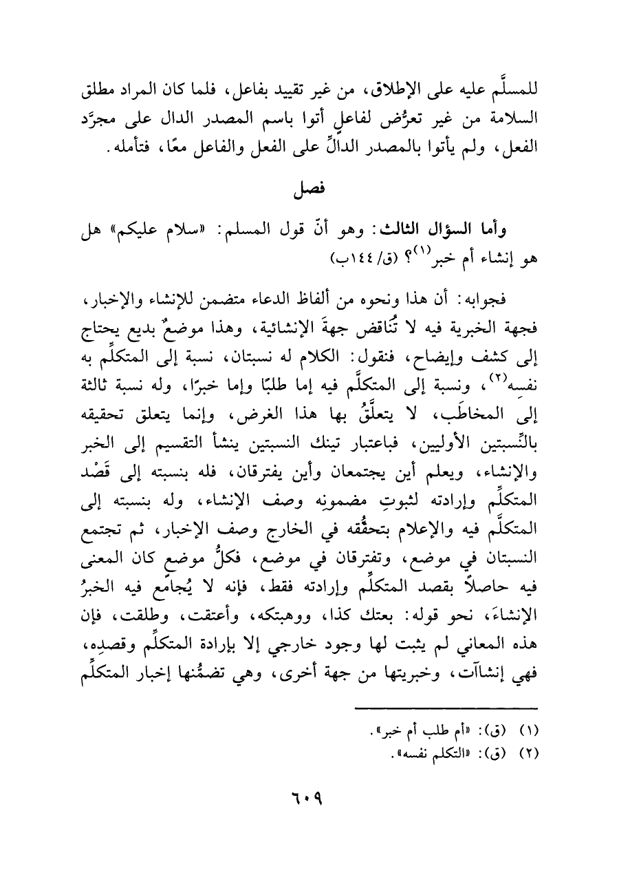 وأما السؤال الثالث: وهو أن قول المسلم: "سلام عليكم" هل هو إنشاء أم خبر (¬١)؟