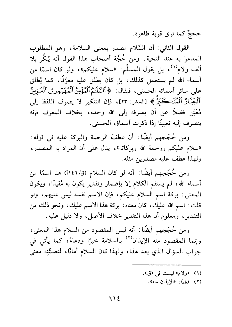 ومن حُجَجهم أيضًا: أنه لو كان السلام (ق/١٤٦ أ) هنا اسمًا من أسماء الله، لم يستقم الكلام إلا بإضمار وتقدير يكون به مُقيدًا، ويكون المعنى بركة اسم السلام عليكم، فإن الاسم نفسه ليس عليهم، ولو قلت: اسم الله عليك، كان معناه: بركة هذا الاسم عليك، ونحو ذلك من التقدير، ومعلوم أن هذا التقدير خلاف الأصل، ولا دليل عليه.