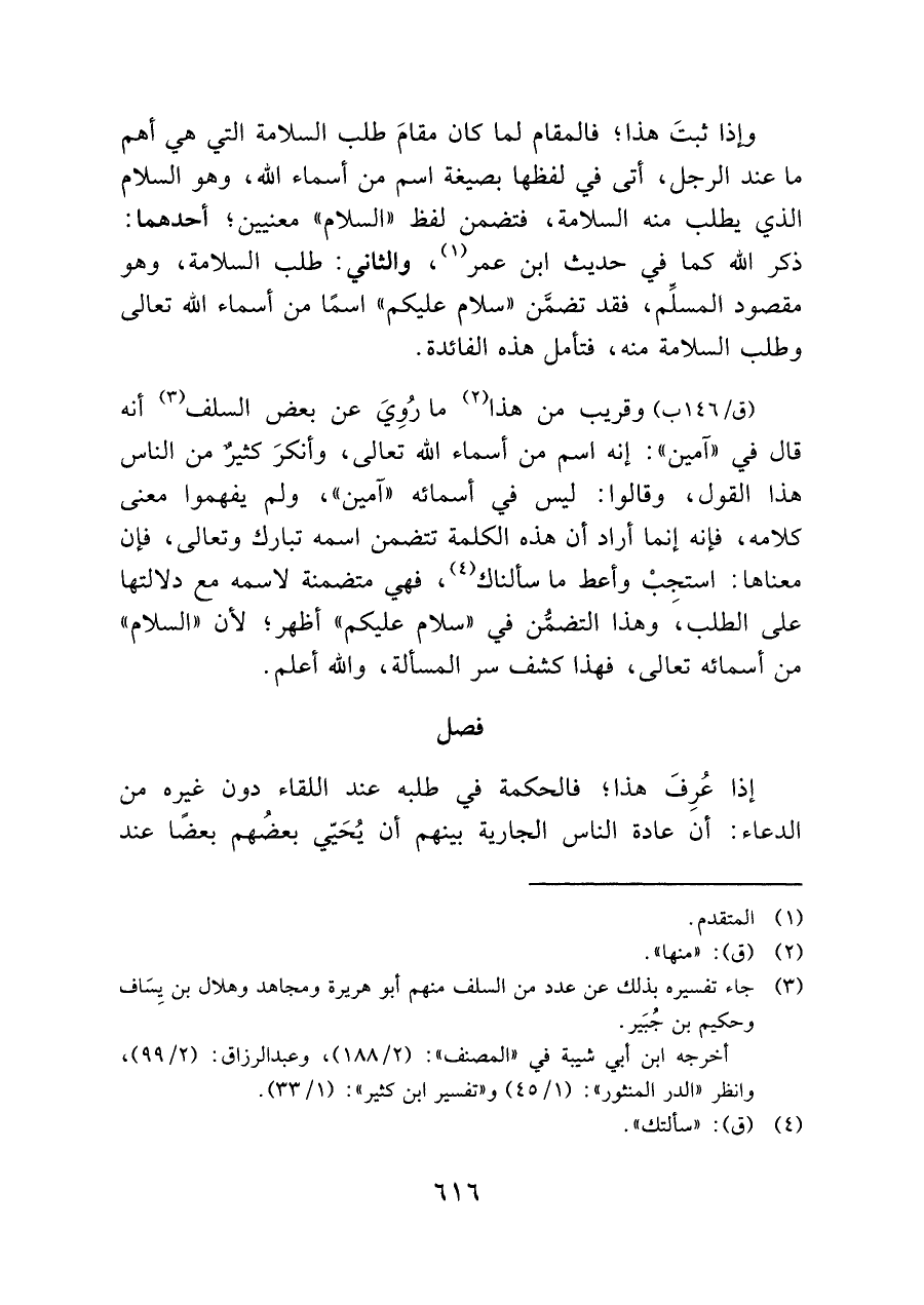 (ق/١٤٦ ب) وقريب من هذا (¬٢) ما رُوِيَ عن بعض السلف (¬٣) أنه قال في "آمين": أنه اسم من أسماء الله تعالى، وأنكرَ كثيرٌ من الناس هذا القول، وقالوا: ليس في أسمائه "آمين"، ولم يفهموا معنى كلامه، فإنما أراد أن هذه الكلمة تتضمن اسمه تبارك وتعالى، فإن معناها استجِبْ وأعط ما سألناك (¬٤)، فهي متضمنة لاسمه مع دلالتها على الطلب، وهذا التضمن في "سلام عليكم" أظهر، لأن "السلام" من أسمائه تعالى، فهذا كشف سر المسألة, والله أعلم.