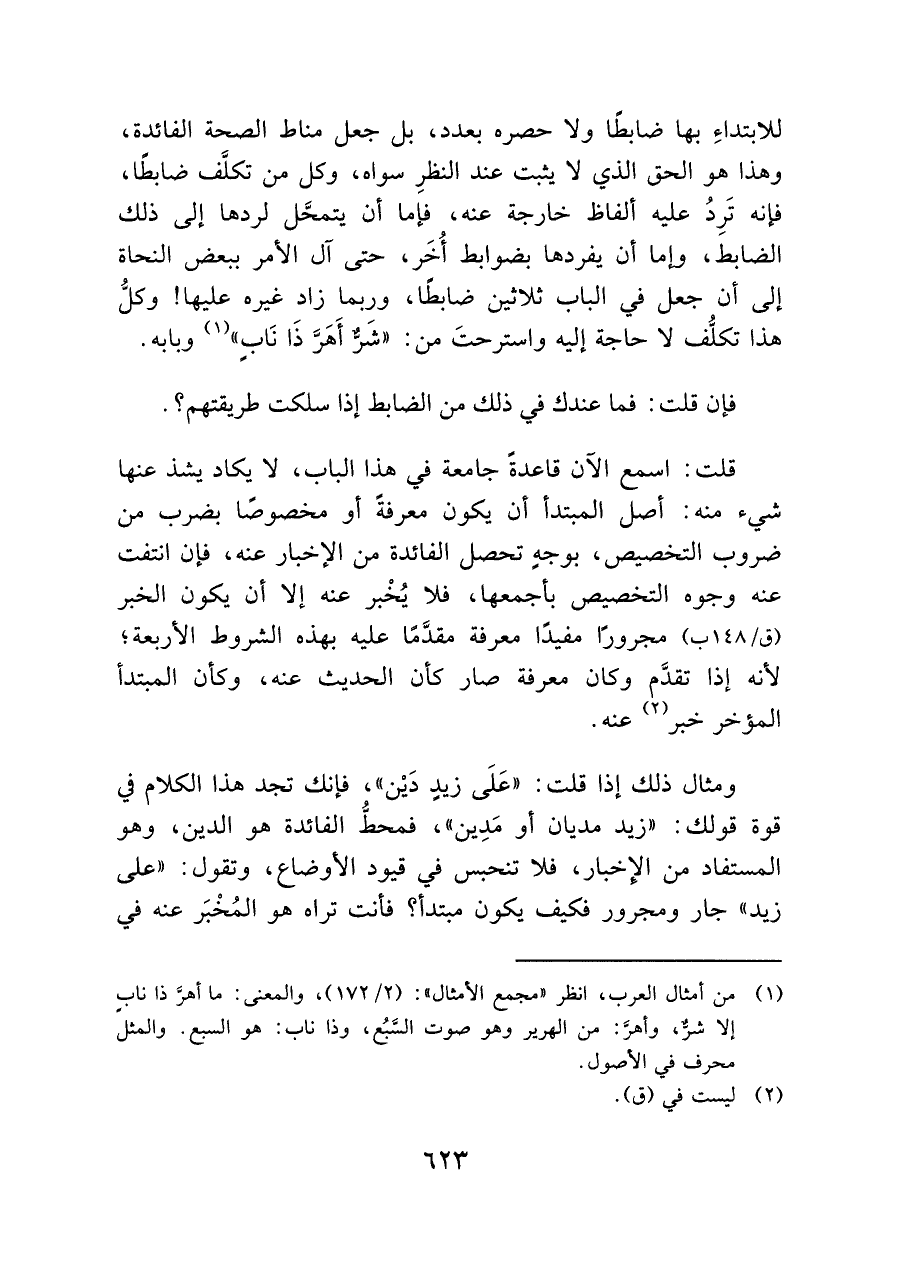 للابتداءِ بها ضابطًا ولا حصره بعدد، بل جعل مناط الصحة الفائدة، وهذا هو الحق الذي لا يثبت عند النظر سواه، وكل من تكلَّف ضابطًا، فإنه تَرِدُ عليه ألفاظ خارجة عنه، فإما أن يتمحَّل لردها إلى ذلك الضابط، وإما أن يفردها بضوابط أُخَر، حتى آل الأمر ببعض النحاة إلى أن جعل في الباب ثلاثين ضابطًا، وربما زاد غيره عليها! وكلُّ هذا تكلُّف لا حاجة إليه واسترحتَ من: "شَرٌّ أَهَرَّ ذَا نَاب" (¬١) وبابه.