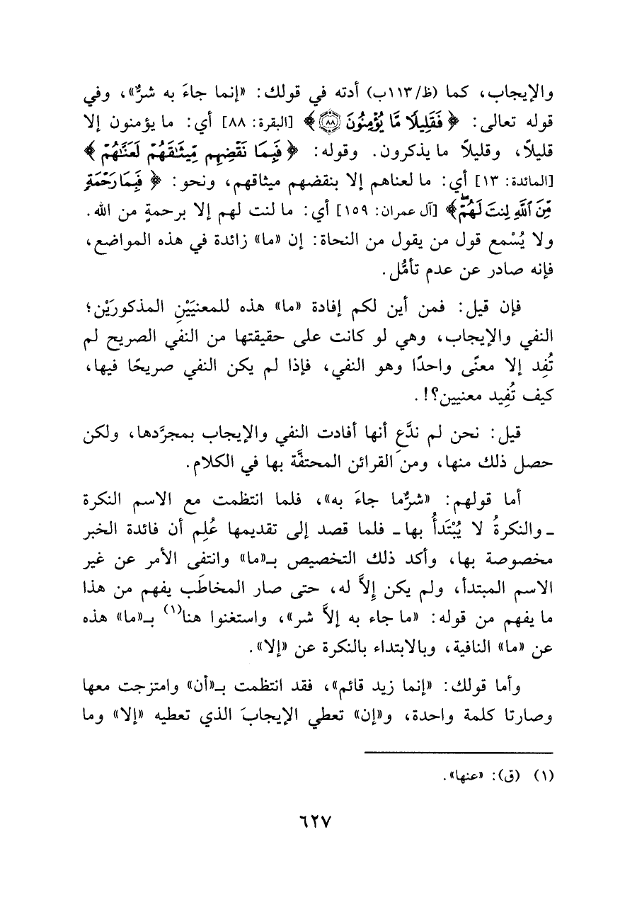 والإيجاب، كما (ظ/١١٣ ب) أدته في قولك: "إنما جاءَ به شرٌّ" وفي قوله تعالى: {فَقَلِيلًا مَا يُؤْمِنُونَ (٨٨)} [البقرة: ٨٨] أي: ما يؤمنون إلا قليلًا، وقليلًا ما يذكرون.