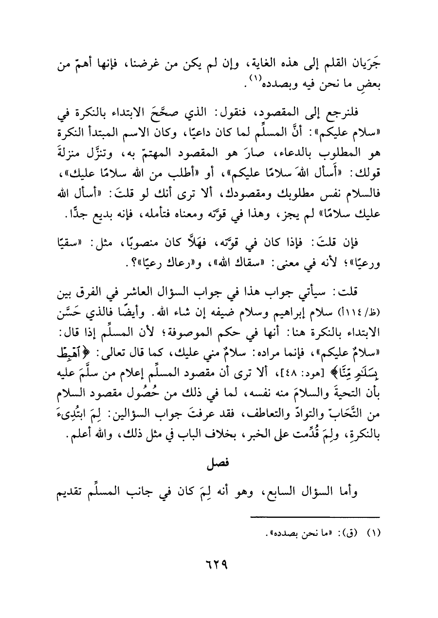 فلنرجع إلى المقصود، فنقول: الذي صحَّحَ الابتداء بالنكرة في "سلام عليكم": أنَّ المسلِّم لما كان داعيًا، وكان الاسم المبتدأ النكرة هو المطلوب بالدعاء، صارَ هو المقصود المهتمّ به، وتنزَّل منزلةَ قولك: "أَسأل اللهَ سلامًا عليكم"، أو "أطلب من الله سلامًا عليك"، فالسلام نفى مطلوبك ومقصودك، ألا ترى أنك لو قلتَ: "أسأل الله عليك سلامًا" لم يجز، وهذا في قوَّته ومعناه فتأمله، فإنه بديع جدًّا.