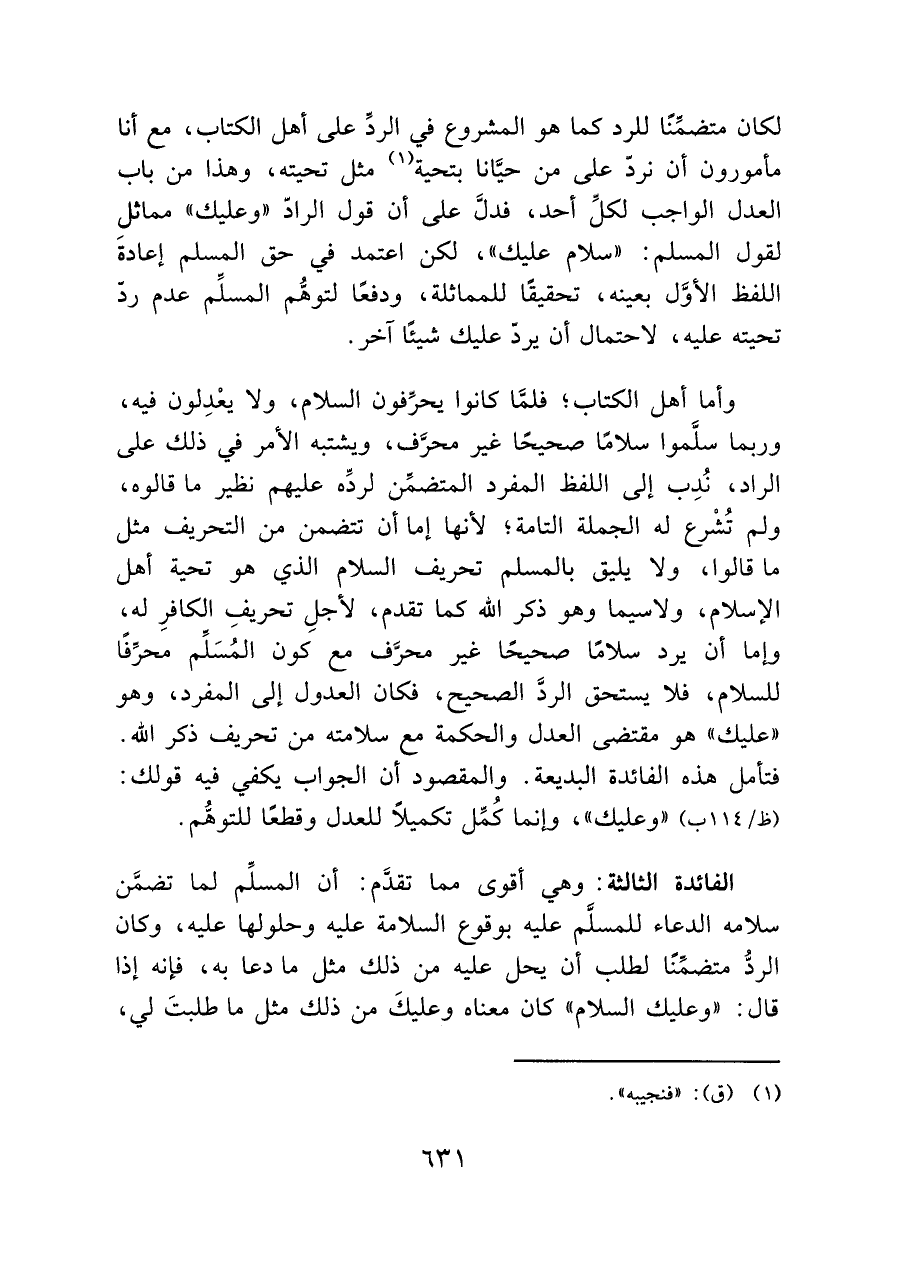 وأما أهل الكتاب؛ فلمَّا كانوا يحرِّفون السلام، ولا يعْدِلون فيه، وربما سلَّموا سلامًا صحيحًا غير محرَّف، ويشتبه الأمر في ذلك على الراد، نُدِب إلى اللفظ المفرد المتضمِّن لردِّه عليهم نظير ما قالوه، ولم تُشْرع له الجملة التامة، لأنها إما أن تتضمن من التحريف مثل ما قالوا، ولا يليق بالمسلم تحريف السلام الذي هو تحية أهل الإسلام، ولا سيما وهو ذكر الله كما تقدم، لأجلِ تحريفِ الكافرِ له، وإما أن يرد سلامًا صحيحًا غير محرَّف مع كون المُسَلِّم محرِّفًا للسلام، فلا يستحق الردَّ الصحيح، فكان العدول إلى المفرد، وهو "عليك" هو مقتضى العدل والحكمة مع سلامته من تحريف ذكر الله. فتأمل هذه الفائدة البديعة. والمقصود أن الجواب يكفي فيه قولك: (ظ / ١١٤ ب) "وعليك"، وإنما كُمِّل تكميلًا للعدل وقطعًا للتوهُّم.