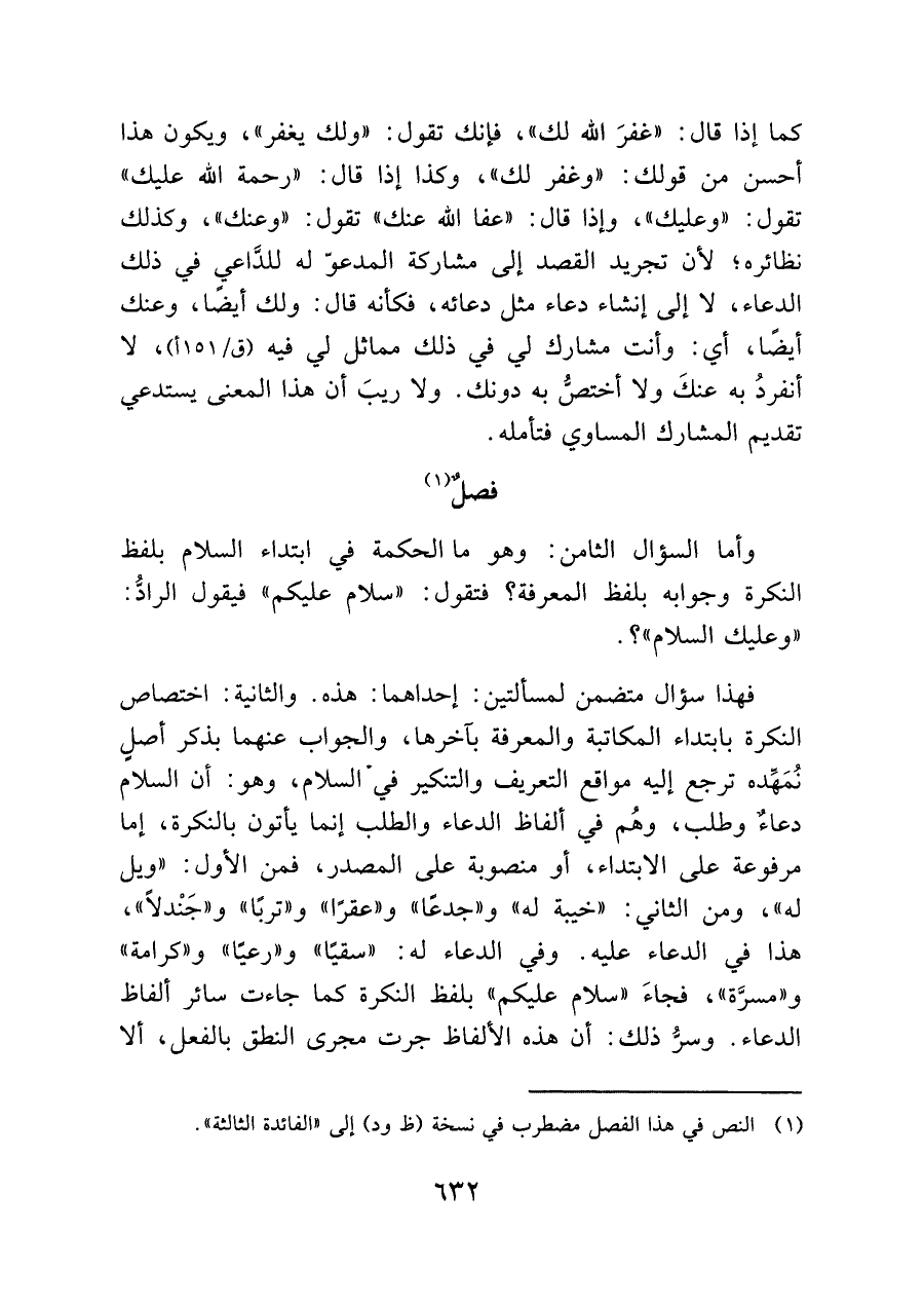 كما إذا قال: "غفرَ الله لك"، فإنك تقول: "ولك يغفر"، ويكون هذا أحسن من قولك: "وغفر لك"، وكذا إذا قال: "رحمة الله عليك" تقول: "وعليك"، وإذا قال: "عفا الله عنك" تقول: "وعنك"، وكذلك نظائره؛ لأن تجريد القصد إلى مشاركة المدعوّ له للدَّاعي في ذلك الدعاء، لا إلى إنشاء دعاء مثل دعائه، فكأنه قال: ولك أيضًا، وعنك أيضًا، أي: وأنت مشارك لي في ذلك مماثل لي فيه (ق / ١٥١ أ)، لا أنفردُ به عنكَ ولا أختصُّ به دونك. ولا ريبَ أن هذا المعنى يستدعي. تقديم المشارك المساوي فتأمله.