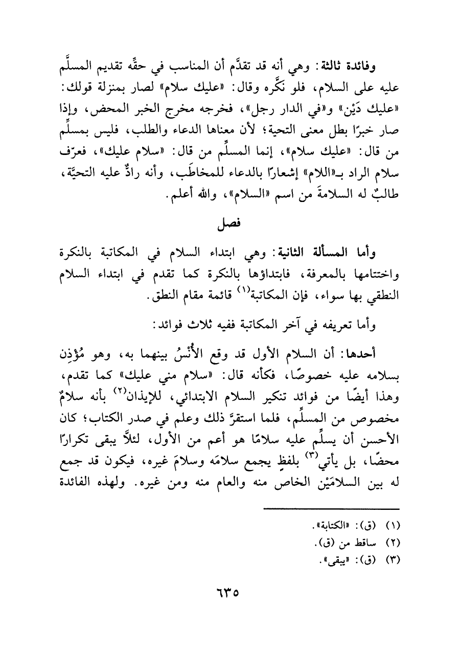 أحدهما: أن السلام الأول قد وقع الأُنْسُ بينهما به، وهو مُؤْذِن بسلامه عليه خصوصًا، فكأنه قال: "سلام مني عليك" كما تقدم، وهذا أيضًا من فوائد تنكير السلام الابتدائي، للإيذان (¬٢) بأنه سلامٌ مخصوص من المسلِّم، فلما استقرَّ ذلك وعلم في صدر الكتاب؛ كان الأحسن أن يسلِّم عليه سلامًا هو أعم من الأول، لئلَّا يبقى تكرارًا محضًا، بل يأتي (¬٣) بلفظٍ يجمع سلامَه وسلامَ غيره، فيكون قد جمع له بين السلامَيْن الخاص منه والعام منه ومن غيره. ولهذه الفائدة
