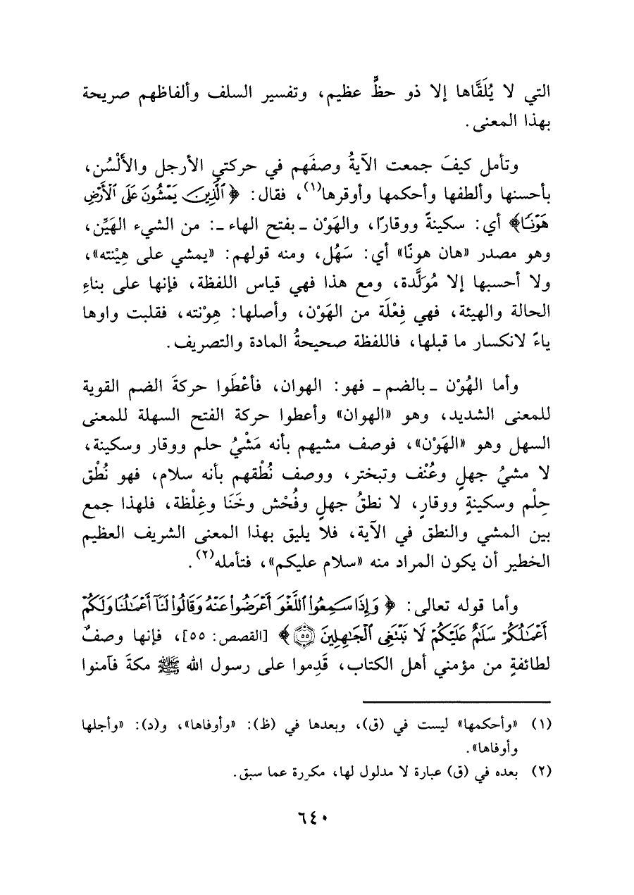 وأما الهوْن -بالضم- فهو: الهوان، فأعْطَوا حركةَ الضم القوية للمعنى الشديد، وهو "الهوان" وأعطوا حركة الفتح السهلة للمعنى السهل وهو "الهوْن"، فوصف مشيهم بأنه مَشْيُ حلم ووقار وسكينة، لا مشيُ جهلٍ وعُنْف وتبختر، ووصف نُطقهم بأنه سلام، فهو نُطق حِلْم وسكينةٍ ووقارٍ، لا نطقُ جهل وفُحْش وخَنَا وغِلْظة، فلهذا جمع بين المشي والنطق فى الآية، فلا يليق بهذا المعنى الشريف العظيم الخطير أن يكون المراد منه "سلام عليكم"، فتأمله (¬٢).