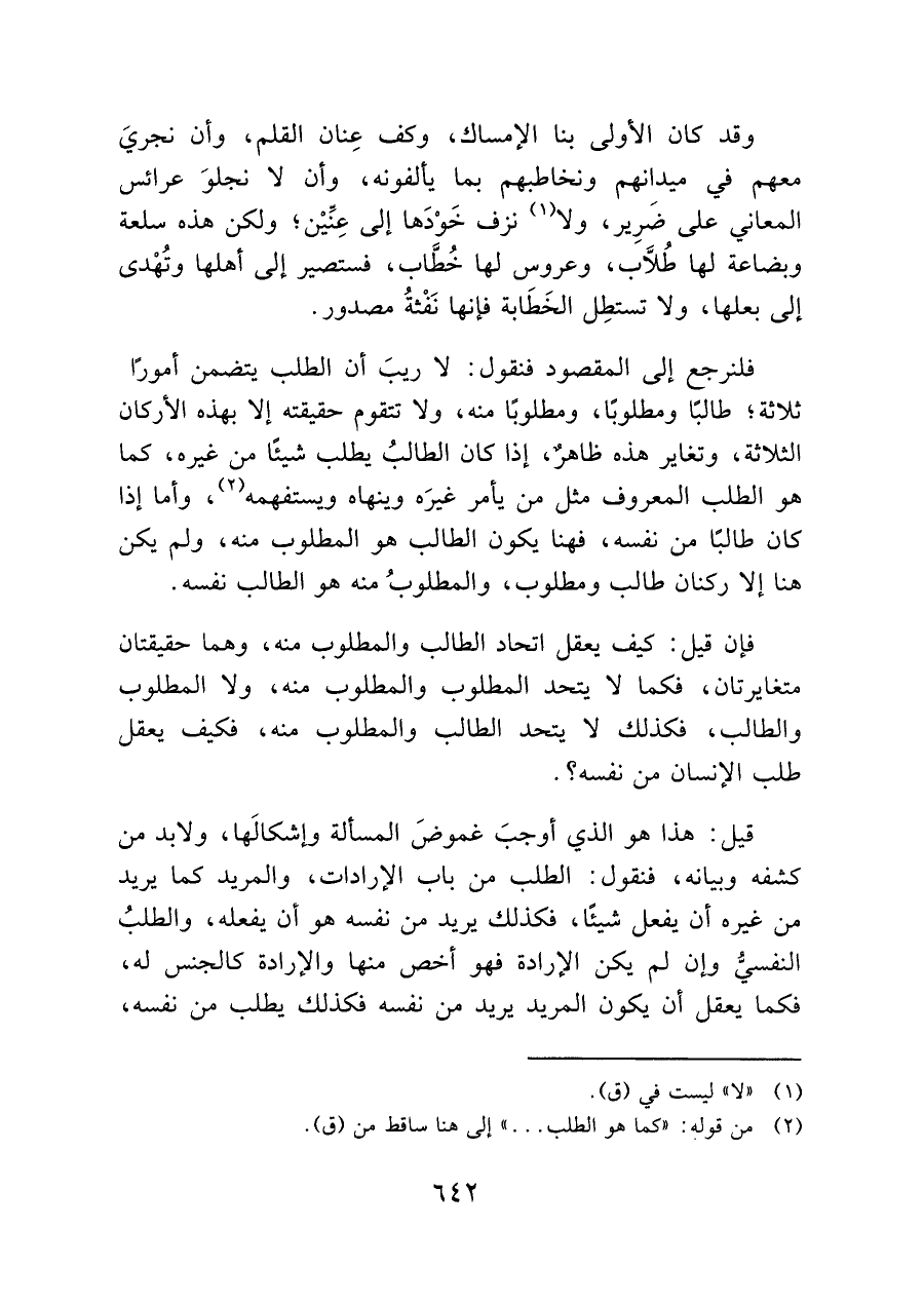 فلنرجع إلى المقصود فنقول: لا ريبَ أن الطلب يتضمن أمورًا ثلاثة؛ طالبًا ومطلوبًا؛ ومطلوبًا منه، ولا تتقوم حقيقته إلا بهذه الأركان الثلاثة، وتغاير هذه ظاهرٌ، إذا كان الطالب يطلب شيئًا من غيره، كما هو الطلب المعروف مثل من يأمر غيرَه وينهاه ويستفهمه (¬٢)، وأما إذا كان طالبًا من نفسه، فهنا يكون الطالب هو المطلوب منه، ولم يكن هنا إلا ركنان طالب ومطلوب، والمطلوب منه هو الطالب نفسه.