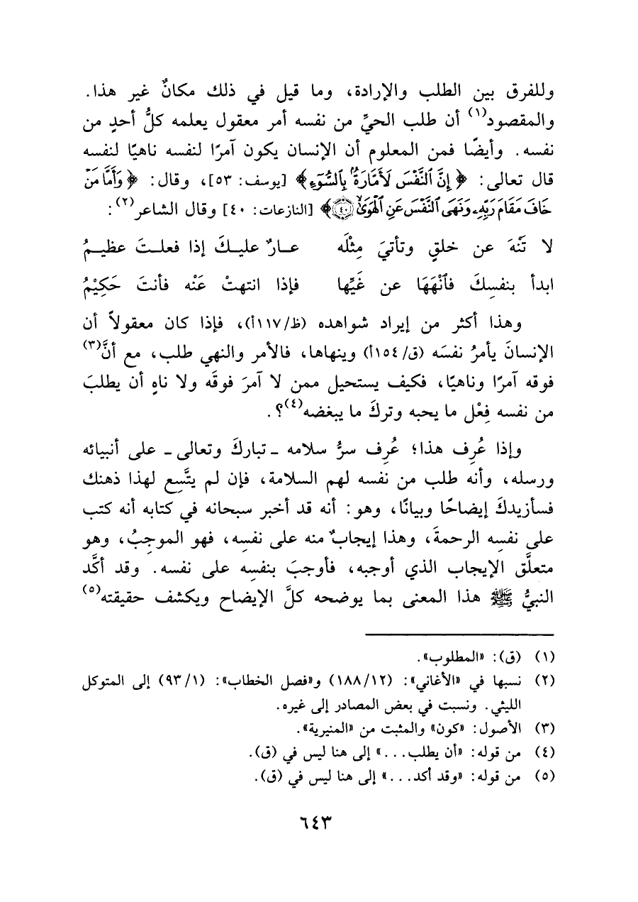 وللفرق بين الطلب والإرادة، وما قيل في ذلك مكانٌ عير هذا. والمقصود (¬١) أن طلب الحيِّ من نفسه أمر معقول يعلمه كل أحدٍ من نفسه. وأيضًا فمن المعلوم أن الإنسان يكون آمرًا لنفسه ناهيًا لنفسه قال تعالى: {إِنَّ النَّفْسَ لَأَمَّارَةٌ بِالسُّوءِ} [يوسف: ٥٣]، وقال: {وَأَمَّا مَن خَافَ مَقَامَ رَبِّهِ وَنَهَى النَّفْسَ عَنِ الهَوَى} [النازعات: ٤٠] وقال الشاعر (¬٢):