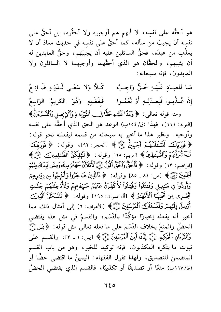 ومنه قوله تعالى: {حَقًّا فِي التَّوْرَاةِ وَالْإِنْجِيلِ وَالْقُرْآنِ}، فهذا الوعد هو الحق الذي أحقَّه على نفسه وأوجبه. ونظير هذا ما أخبر به سبحانه من قسمه ليفعلنه نحو قوله: {فَوَرَبِّكَ لَنَسْئَلَنَّهُمْ أَجْمَعِينَ} [الحجر: ٩٢]، وقوله: {فَوَرَبِّكَ لَنَحْشُرَنَّهُمْ وَالشَّيَاطِينَ} [مريم: ٦٨] وقوله: {لَنُهْلِكَنَّ الظَّالِمِينَ (١٣)} [إبراهيم: ١٣] وقوله: {قَالَ فَالْحَقُّ وَالْحَقَّ أَقُولُ (٨٤) لَأَمْلَأَنَّ جَهَنَّمَ مِنْكَ وَمِمَّنْ تَبِعَكَ مِنْهُمْ أَجْمَعِينَ (٨٥)} [ص: ٨٤، ٨٥]، وقوله: {فَالَّذِينَ هَاجَرُوا وَأُخْرِجُوا مِنْ دِيَارِهِمْ وَأُوذُوا فِي سَبِيلِي وَقَاتَلُوا وَقُتِلُوا لَأُكَفِّرَنَّ عَنْهُمْ سَيِّئَاتِهِمْ وَلَأُدْخِلَنَّهُمْ جَنَّاتٍ تَجْرِي مِنْ تَحْتِهَا الْأَنْهَارُ ثَوَابًا مِنْ عِنْدِ اللَّهِ وَاللَّهُ عِنْدَهُ حُسْنُ الثَّوَابِ (١٩٥)} [آل عمران: ١٩٥]، وقوله: {فَلَنَسْأَلَنَّ الَّذِينَ أُرْسِلَ إِلَيْهِمْ وَلَنَسْأَلَنَّ الْمُرْسَلِينَ (٦)} [الأعراف: ٦]، إلى أمثال ذلك مما أخبر أنه يفعله إخبارًا مؤكَّدًا بالقَسَم، والقسمُ في مثل هذا يقتضي الحضَّ والمنعَ بخلاف القَسَم على ما فعله تعالى مثل قوله: {يس (١) وَالْقُرْآنِ الْحَكِيمِ (٢) إِنَّكَ لَمِنَ الْمُرْسَلِينَ (٣)} [يس: ١ - ٣]، والقسم على ثبوت ما ينكره المكذبون، فإنه توكيد للخبر، وهو من باب القسم المتضمن للتصديق، ولهذا تقول الفقهاء: اليمين ما اقتضى حضًّا أو منعًا أو تصديقًا أو تكذيبًا، فالقسم الذي يقتضي الحضَّ