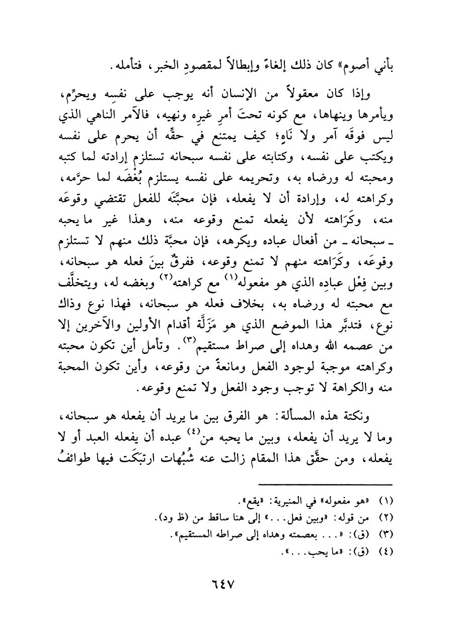 ونكتة هذه المسألة: هو الفرق بين ما يريد أن يفعله هو سبحانه، وما لا يريد أن يفعله، وبين ما يحبه من (¬٤) عبده أن يفعله العبد أو لا يفعله، ومن حقَّق هذا المقام زالت عنه شُبُهات ارتبَكَت فيها طوائفُ