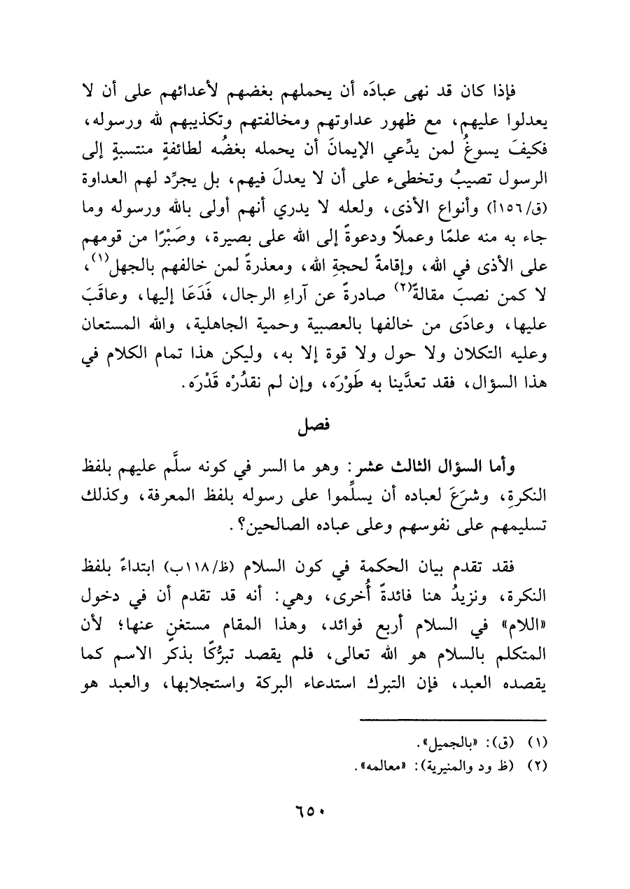 وأما السؤال الثالث عشر: وهو ما السر في كونه سلَّم عليهم بلفظ النكرةِ، وشرَعَ لعباده إن يسلِّموا على رسوله بلفظ المعرفة، وكذلك تسليمهم على نفوسهم وعلى عباده الصالحين؟.