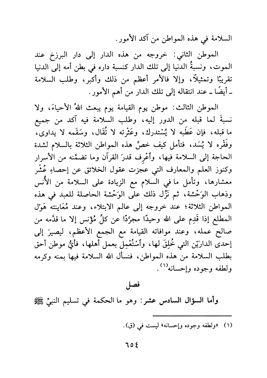 الموطن الثالث: موطن يوم القيامة يوم يبعث اللهُ الأحياءَ، ولا نسبةَ لما قبله من الدور إليه، وطلب السلامة فيه آكد من جميع ما قبله، فإن عَطَبه لا يُسْتدرك، وعَثْرته لا تُقَال، وسَقَمه لا يداوى، وفَقْره لا يُسَد، فتأمل كيف خصَّ هذه المواطن الثلاثة بالسلام لشدة الحاجة إلى السلامة فيها، واعْرِف قدرَ القرآن وما تضمَّنه من الأسرار وكنوز العلم والمعارف التي عجزت عقول الخلائق عن إحصاءِ عُشر معشارها، وتأمل ما في السلام مع الزيادة على السلامة من الأُنس وذهاب الوَحْشة، ثم نَزِّل ذلك على الوَحْشة الحاصلة للعبد في هذه المواطن الثلاثة؛ عند خروجه إلى عالم الابتلاء، وعند مُعَاينته هَوْل المطلع إذا قَدِمْ على الله وحيدًا مجرَّدًا عن كلِّ مُؤْنس إلا ما قدَّمه من صالح عمله، وعند موافاته القيامة مع الجمع الأعظم، ليصيرَ إلى إحدى الدارَيْن التي خُلِق لها، واسْتُعْمِل بعمل أهلها، فأيُّ موطن أحق بطلب السلامة من هذه المواطن، فنسأل الله السلامة فيها بمنه وكرمه ولطفه وجوده وإحسانه (¬١).
