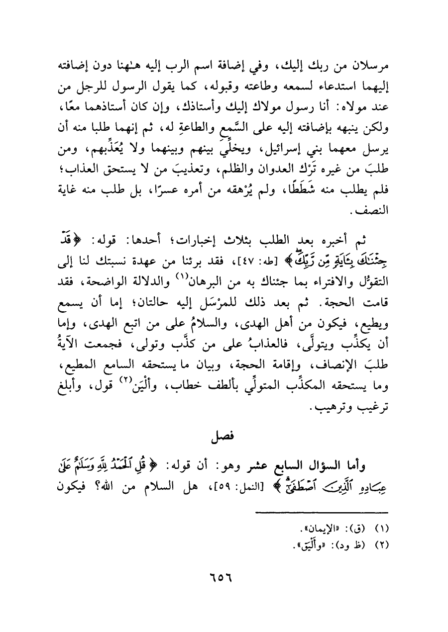 ثم أخبره بعد الطلب بثلاث إخبارات؛ أحدها: قوله: {قَدْ جِئْنَاكَ بِآيَةٍ مِنْ رَبِّكَ} [طه: ٤٧]، فقد برئنا من عهدة نسبتك لنا إلى التقوُّل والافتراء بما جئناك به من البرهان (¬١) والدلالة الواضحة، فقد قامت الحجة. ثم بعد ذلك للمرْسَل إليه حالتان، إما أن يسمع ويطيع، فيكون من أهل الهدى، والسلامُ على من اتبع الهدى، وإما أن يكذِّب ويتولَّى، فالعذابُ على من كذَّب وتولى، فجمعت الآيةُ طلبَ الإنصاف، وإقامة الحجة، وبيان ما يستحقه السامع المطيع، وما يستحقه المكذِّب المتولِّي بألطف خطاب، وألْيَن (¬٢) قول، وأبلغ ترغيب وترهيب.