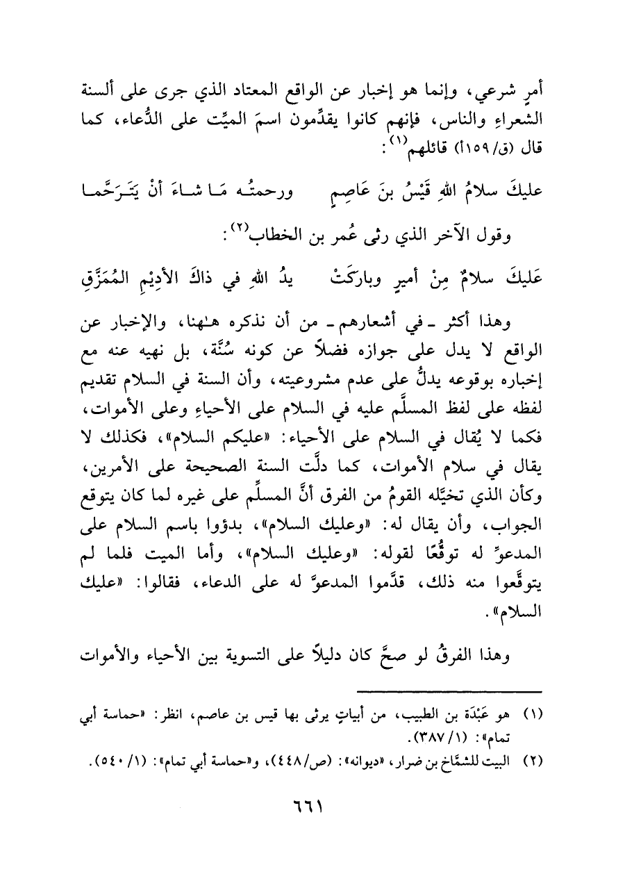 وهذا أكثر -في أشعارهم- من أن نذكره هاهنا، والإخبار عن الواقع لا يدل على جوازه فضلًا عن كونه سُنَّة، بل نهيه عنه مع إخباره بوقوعه يدلُّ على عدم مشروعيته، وأن السنة في السلام تقديم لفظه على لفظ المسلَّم عليه في السلام على الأحياءِ وعلى الأموات، فكما لا يُقال في السلام على الأحياء: "عليكم السلام"، فكذلك لا يقال في سلام الأموات، كما دلَّت السنة الصحيحة على الأمرين، وكأن الذي تخيَّله القومُ من الفرق أنَّ المسلِّم على غيره لما كان يتوقع الجواب، وأن يقال له: "وعليك السلام"، بدؤوا باسم السلام على المدعوِّ له توقُعًا لقوله: "وعليك السلام"، وأما الميت فلما لم يتوقَّعوا منه ذلك، قدموا المدعوَّ له على الدعاء، فقالوا: "عليك السلام".