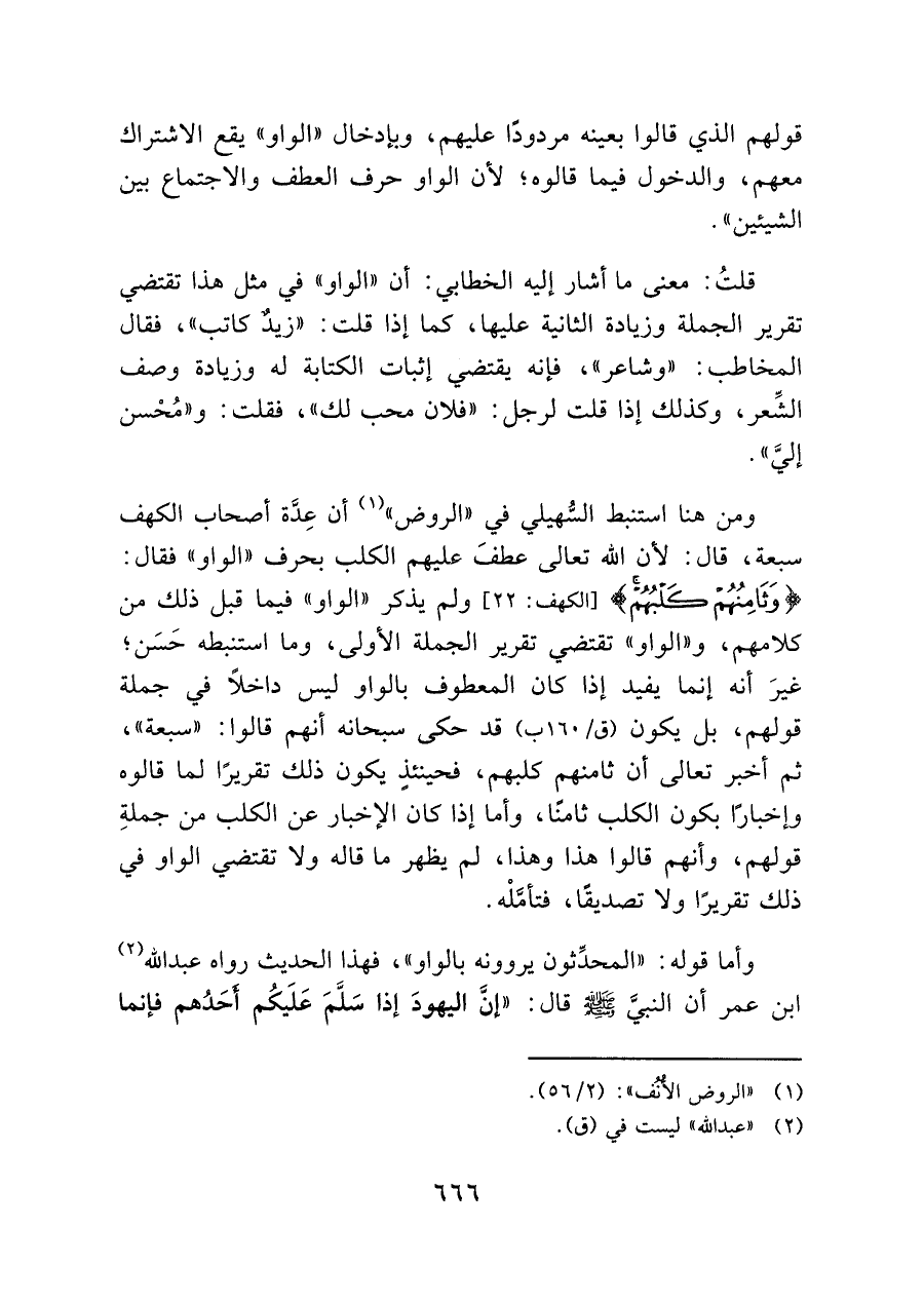 ومن هنا استنبط السُّهيلي في "الروض" (¬١) أن عِدَّة أصحاب الكهف سبعة، قال: لأن الله تعالى عطفَ عليهم الكلب بحرف "الواو" فقال: {وَثَامِنُهُمْ كَلْبُهُمْ} [الكهف: ٢٢]، ولم يذكر "الواو" فيما قبل ذلك من كلامهم، و"الواو" تقتضي تقرير الجملة الأولى، وما استنبطه حسَن؛ غير أن إنما يفيد إذا كان المعطوف بالواو ليس داخلاً في جملة قولهم، بل يكون (ق/١٦٠ ب) قد حكى سبحانه أنهم قالوا: "سبعة"، ثم أخبر تعالى أن ثامنهم كلبهم، فحينئذٍ يكون ذلك تقريرًا لما قالوه وإخبارًا بكون الكلب ثامنًا، وأما إذا كان الإخبار عن الكلب من جملةِ قولهم، وأنهم قالوا هذا وهذا، لم يظهر ما قاله ولا تقتضي الواو في ذلك تقريرًا ولا تصديقًا، فتأمَّلْه.