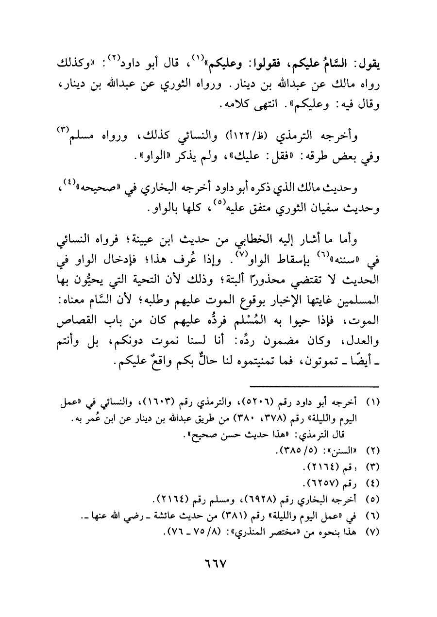 وأخرجه الترمذي (ظ/ ١٢٢ أ)، والنسائي كذلك، ورواه مسلم (¬٣) وفي بعض طرقه: "فقل: عليك"، ولم يذكر "الواو".