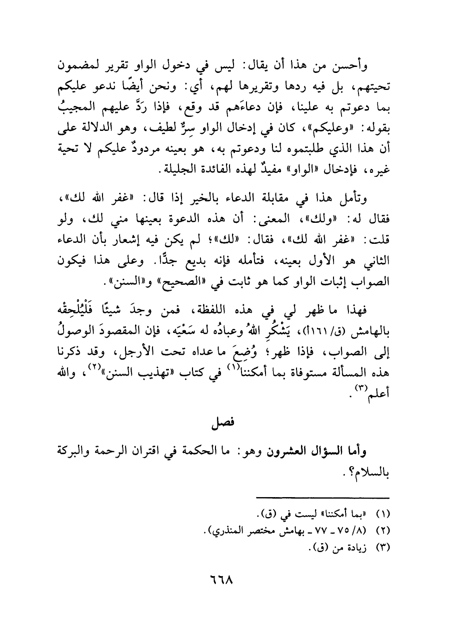 وتأمل هذا في مقابلة الدعاء بالخير إذا قال: "غفر الله لك"، فقال له: "ولك"، المعنى: أن هذه الدعوة بعينها مني لك، ولو قلت: "غفر الله لك": فقال: "لك"؟ لم يكن فيه إشعار بأن الدعاء الثاني هو الأول بعينه، فتأمله فإنه بديع جدًّا. وعلى هذا فيكون الصواب إثبات الواو كما هو ثابت في "الصحيح" و"السنن".