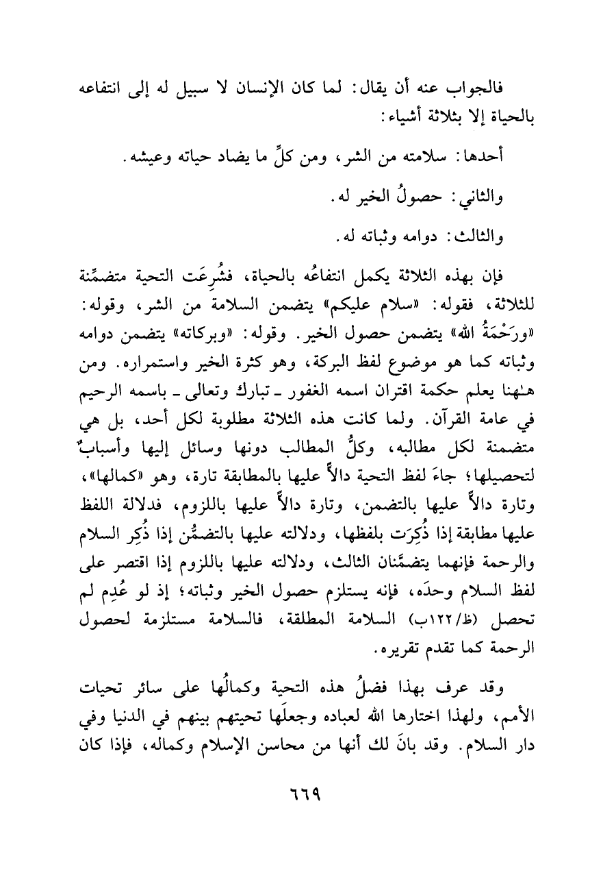 فإن بهذه الثلاثة يكمل انتفاعُه بالحياة، فشُرِعَت التحية متضمنة للثلاثة، فقوله: "سلام عليكم" يتضمن السلامة من الشر، وقوله: "ورَحْمَةُ الله" يتضمن حصول الخير. وقوله: "وبركاته" يتضمن دوامه وثباته كما هو موضوع لفظ البركة، وهو كثرة الخير واستمراره. ومن هاهنا يعلم حكمة اقتران اسمه الغفور -تبارك وتعالى- باسمه الرحيم في عامة القرآن. ولما كانت هذه الثلاثة مطلوبة لكل أحد، بل هي متضمنة لكل مطالبه، وكلّ المطالب دونها وسائل إليها وأسباب لتحصيلها؛ جاءَ لفظ التحية دالاً عليها بالمطابقة تارة، وهو "كمالها"، وتارة دالاً عليها بالتضمن، وتارة دالاً عليها باللزوم، فدلالة اللفظ عليها مطابقة إذا ذُكِرَت بلفظها، ودلالته عليها بالتضمُّن إذا ذُكِر السلام والرحمة فإنهما يتضمنان الثالث، ودلالته عليها باللزوم إذا اقتصر على لفظ السلام وحدَه، فإنه يستلزم حصول الخير وثباته؛ إذ لو عُدِم لم تحصل (ظ / ١٢٢ ب) السلامة المطلقة، فالسلامة مستلزمة لحصول الرحمة كما تقدم تقريره.