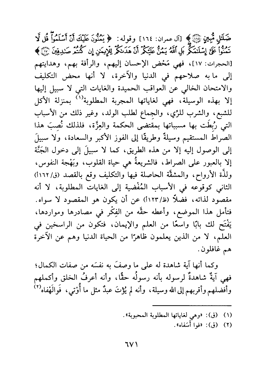ضَلَالٍ مُبِينٍ (١٦٤)} [آل عمران: ١٦٤] وقوله: {يَمُنُّونَ عَلَيْكَ أَنْ أَسْلَمُوا قُلْ لَا تَمُنُّوا عَلَيَّ إِسْلَامَكُمْ بَلِ اللَّهُ يَمُنُّ عَلَيْكُمْ أَنْ هَدَاكُمْ لِلْإِيمَانِ إِنْ كُنْتُمْ صَادِقِينَ (١٧)} [الحجرات: ١٧]، فهي مَحْض الإحسان إليهم، والرأفة بهم، وهدايتهم إلى ما به صلاحهم في الدنيا والآخرة، لا أنها محض التكليف والامتحان الخالي عن العواقب الحميدة والغايات التي لا سبيل إليها إلا بهذه الوسيلة، فهي لغاياتها المجربة المطلوبة (¬١) بمنزلة الأكل للشبع، والشرب للرِّي، والجماع لطلب الولد، وغير ذلك من الأسباب التي رُبطَت بها مسبباتها بمقَتضى الحكمة والعِزَّة، فلذلك نُصبَ هذا الصراطَ المستقيم وسيلة وطريقًا إلى الفوز الأكبر والسعادة، ولا سبيلَ إلى الوصول إليه إلا من هذه الطريق، كما سبيلَ إلى دخول الجَنَّة إلا بالعبور على الصراط، فالشريعةُ هي حياة القلوب، وبَهْجة النفوس، ولذة الأرواح، والمشقة الحاصلة فيها والتكليف وقع بالقصد (ق/ ١٦٢ أ) الثاني كوقوعه في الأسباب المفْضية إلى الغايات المطلوبة، لا أنه مقصود لذاته، فضلاً (ظ / ١٢٣ أ) عن أن يكون هو المقصود لا سواه. فتأمل هذا الموضع، وأعطه حقه من الفِكْر في مصادرها ومواردها، يَفْتَح لك بابًا واسعًا من العلم والإيمان، فتكون من الراسخين في العلم، من الذين يعلمون ظاهرًا من الحياة الدنيا وهم عن الآخرة هم غافلون.