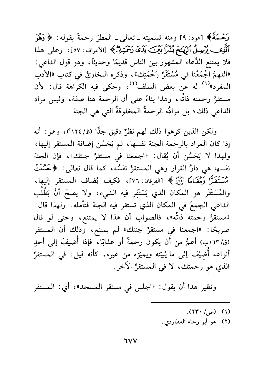 ولكن الدين كرهوا ذلك لهم نظر دقيق جدًّا (ظ/ ١١٢ أ)، وهو: أنه إذا كان المراد بالرحمة الجنة نفسها، لم يَحْسُن إضافة المستقر إليها، ولهذا لا يَحْسُن أن يُقال: "اجمعنا في مستقرِّ جنتك"، فإن الجنة نفسها هى دارُ القرار وهى المستقر نفسُه، كما قال تعالى: {حَسُنَتْ مُسْتَقَرًّا وَمُقَامًا (٧٦)} [الفرقان: ٧٦]، فكيف يضاف المستقر إليها، والمُسْتَقَر هو المكان الذي يَسْتَقِر فيه الشيء، ولا يصحّ أن يَطْلُب الداعي الجمع في المكان الذي تستقر فيه الجنة فتأمله. ولهذا قال: "مستقر رحمته ذاتُه"، فالصواب أن هذا لا يمتنع، وحتى لو قال صريحاً: "اجمعنا في مستقرِّ جنتك" لم يمتنع، وذلك أن المستقر (ق ١٦٣/ ب) أعمّ من أن يكون رحمة أو عذاباً، فإذا أُضيفَ إلى أحدِ أنواعه أُضِيْف إلى ما يُبيّنه ويميزه من غيره، كأنه قيل: في المستقرِّ الذي هو رحمتك، لا في المستقرِّ الآخر.