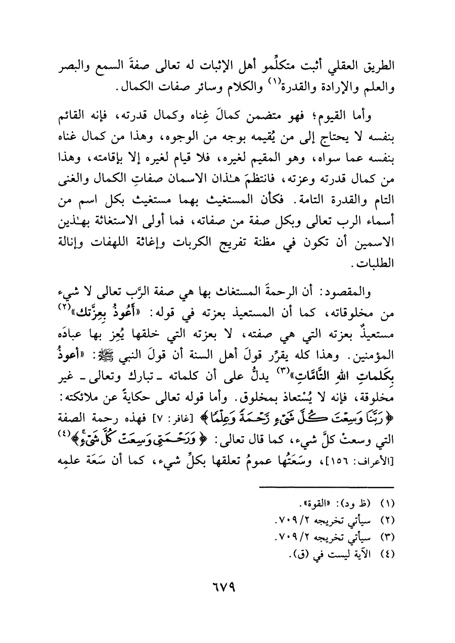 والمقصود: أن الرحمةَ المستغاث بها هي صفة الرب تعالى لا شيء من مخلوقاته، كنا أن المستعيذ بعزته في قوله: "أعُوذُ بعِزتك" (¬٢) مستعيذ بعزته التي هي صفته، لا بعزته التي خلقها يُعِزَ بها عبادَه المؤمنين. وهذا كله يقرر قولَ أهل السنة أن قولَ النبي - صلى الله عليه وسلم -: "أعود بكَلماتِ اللهِ التَّامَّاتِ" (¬٣) يدل على أن كلماته -تبارك وتعالى- غير مَخلوقة، فإنه لا يسْتعاذ بمخلوق. وأما قوله تعالى حكاية عن ملائكته: {رَبَّنَا وَسِعْتَ كُلَّ شَيْءٍ رَحْمَةً وَعِلْمًا} [غافر: ٧] فهذه رحمة الصفة التىِ وسعتْ كلَّ شيء، كنا قال تعالى: {وَرَحْمَتِي وَسِعَتْ كُلَّ شَيْءٍ} (¬٤) [الأعراف: ١٥٦]، وسَعَتُها عمومُ تعلقها بكلِّ شئ، كما أن سَعَة علمه