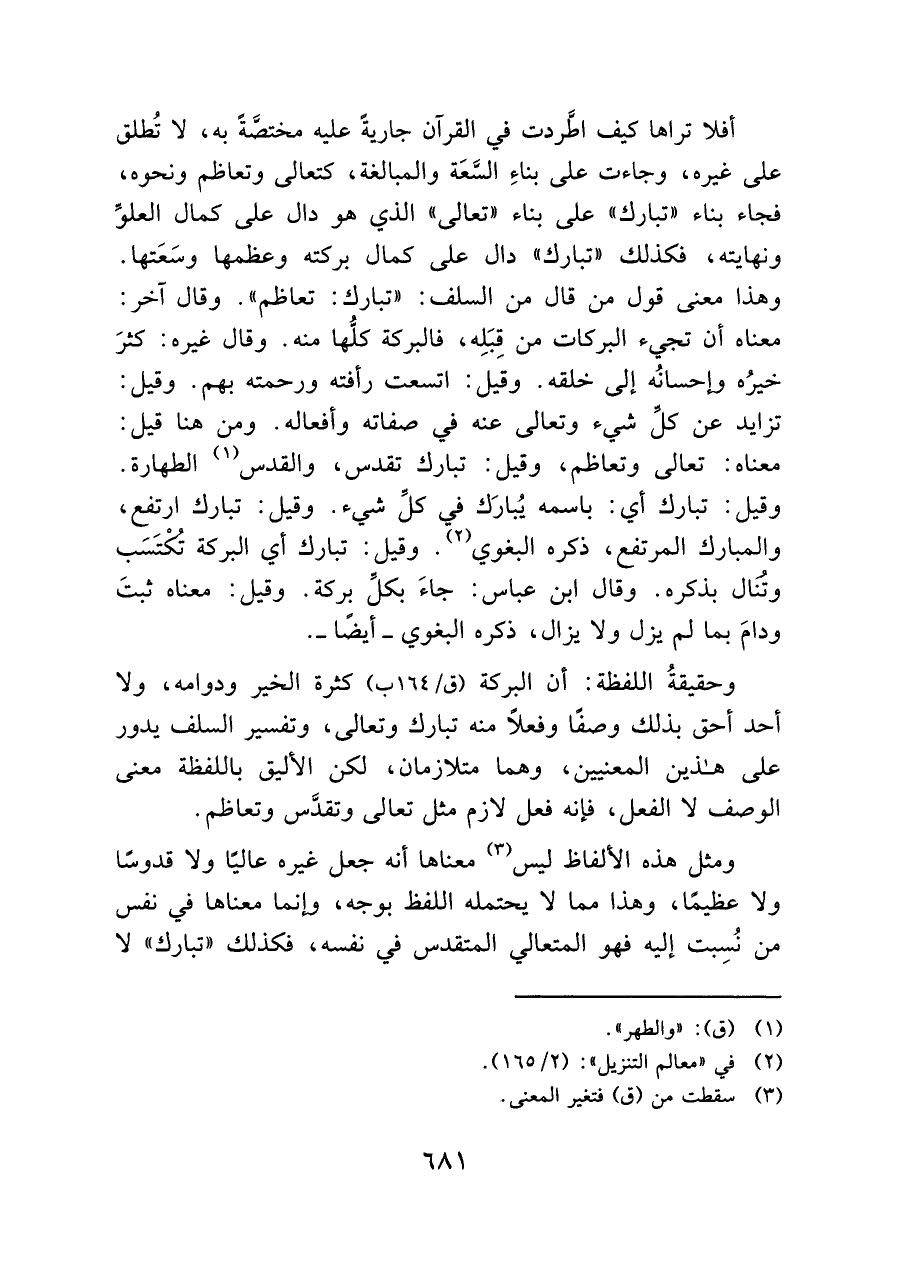 وحقيقةُ اللفظة: أن البركة (ق / ١٦٤ ب] كثرة الخير ودوامه، ولا أحد أحق بذلك وصفًا وفعلاً منه تبارك وتعالى، وتفسير السلف يدور على هذين المعنيين، وهما متلازمان، لكن الأليق باللفظة معنى الوصف لا الفعل، فإنه فعل لازم مثل تعالى وتقدَّس وتعاظم.
