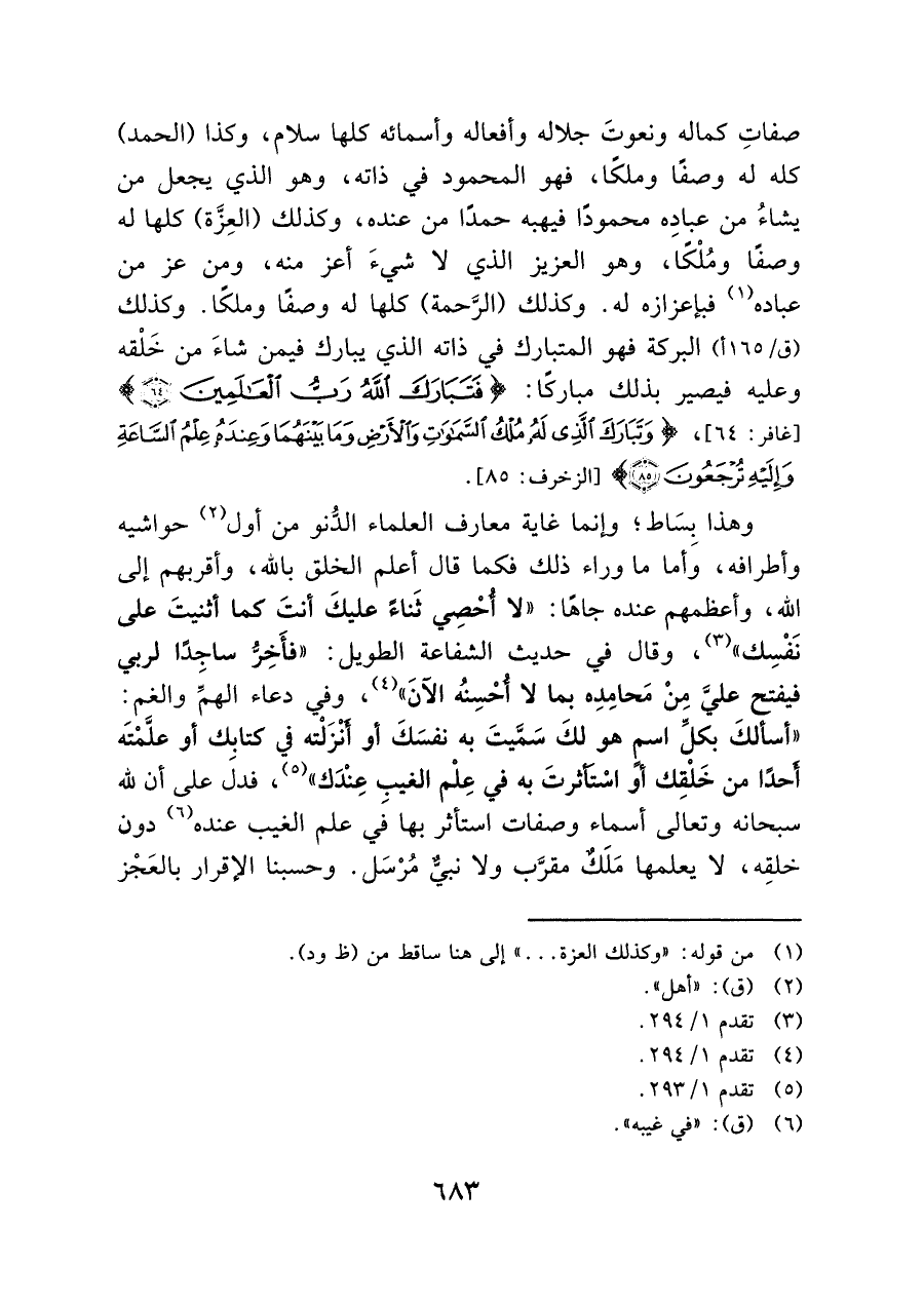 وهذا بِسَاط؛ وإنما غاية معارف العلماء الدُّنو من أول (¬٢) حواشيه وأطرافه، وأما ما وراء ذلك فكما قال أعلم الخلق بالله، وأقربهم إلى الله، وأعظمهم عنده جاهًا: "لا أُحْصِي ثناءً عليكَ أنتَ كما أثنيتَ على نَفْسِك" (¬٣)، وقال في حديث الشفاعة الطويل: "فأَخِرُّ ساجِدًا لربي فيفتح عليَّ مِنْ مَحامِدِه بما لا أحْسِنُه الآنَ" (¬٤)، وفي دعاء الهمِّ والغم: "أسألكَ بكلِّ اسم هو لكَ سَمَّيتَ به نفسَكَ أو أنْزَلْته في كتابك أو علَّمْتَه أحدًا من خَلْقِك أو اسْتأثرتَ به في عِلْم الغيبِ عِنْدَك" (¬٥)، فدلَ على أن لله سبحانه وتعالى أسماء وصفات استأثر بها في علم الغيب عنده (¬٦) دون خلقِه، لا يعلمها مَلك مقرَّب ولا نبى مُرْسَل. وحسبنا الإقرار بالعَجْز