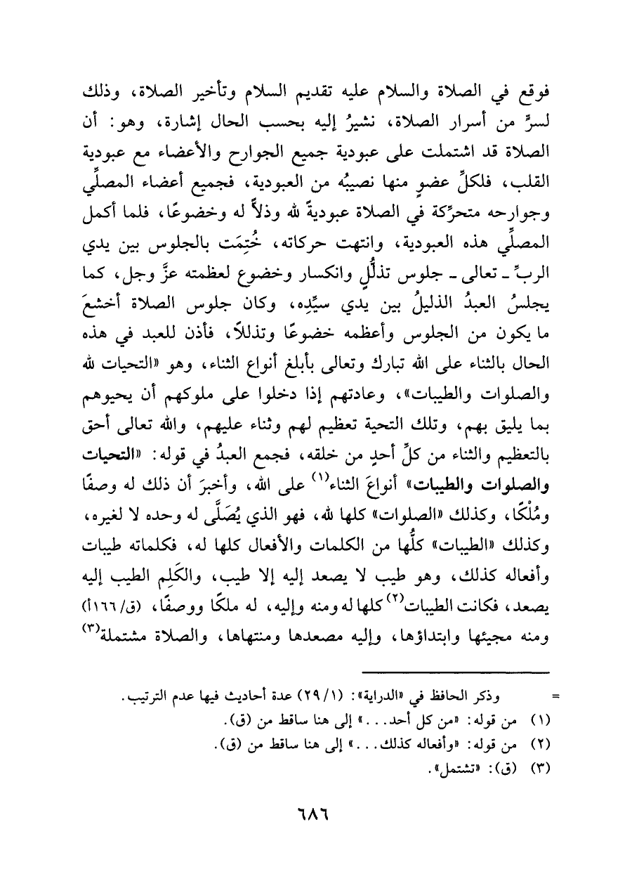 فوقع في الصلاة والسلام عليه تقديم السلام وتأخير الصلاة، وذلك لسر من أسرار الصلاة، نشيرُ إليه بحسب الحال إشارة، وهو: أن الصلاة قد اشتملت علي عبودية جميع الجوارح والأعضاء مع عبودية القلب، فلكلِّ عضوٍ منها نصيبُه من العبودية، فجميع أعضاء المصلِّي وجوارحه متحرِّكة في الصلاة عبودية لله وذلًّا له وخضوعًا، فلما أكمل المصلِّي هذه العبودية، وانتهت حركاته، خُتِمَت بالجلوس بين يدي الربِّ -تعالى- جلوس تذلُّلٍ وانكسار وخضوع لعظمته عزَّ وجل، كما يجلس العبدُ الذليلُ بين يدي سيِّدِه، وكان جلوس الصلاة أخشعَ ما يكون من الجلوس وأعظمه خضوعًا وتذللًا، فأذن للعيد في هذه الحال بالثناء على الله تبارك وتعالى بأبلغ أنواع الثناء، وهو "التحيات لله والصلوات والطيبات"، وعادتهم إذا دخلوا على ملوكهم أن يحيوهم بما يليق بهم، وتلك التحية تعظيم لهم وثناء عليهم، والله تعالى أحق بالتعظيم والثناء من كل أحد من خلقه، فجمع العبدُ في قوله: "التحيات والصلوات والطيبات" أنواعَ الثناء (¬١) على الله، وأخبرَ أن ذلك له وصفا ومُلْكًا، وكذلك "الصلوات" كلها لله، فهو الذي يُصَلَّى له وحده لا لغيره، وكذلك "الطيبات" كلها من الكلمات والأفعال كلها له، فكلماته طيبات وأفعاله كذلك، وهو طيب، يصعد إليه إلا طيب، والكَلِم الطيب إليه يصعد، فكانت الطيبات (¬٢) كلها له ومنه وإليه، له ملكًا ووصفًا، (ق/ ١٦٦ أ) ومنه مجيئها وابتداؤها، وإليه مصعدها ومنتهاها، والصلاة مشتملة (¬٣)