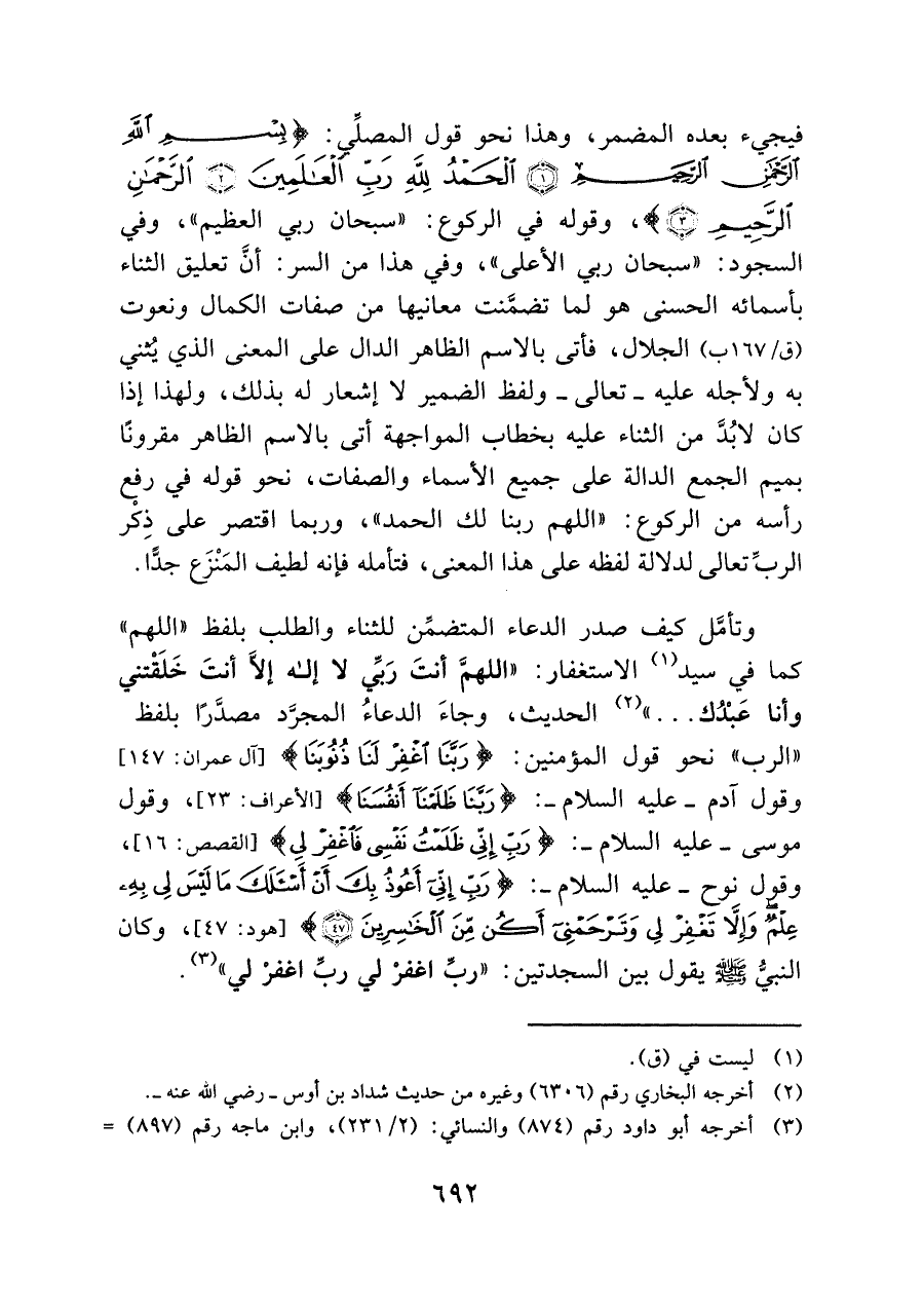 وتأمَّل كيف صدر الدعاء المتضمِّن للثناء والطلب بلفظ "اللهم" كما في سيد (¬١) الاستغفار: "اللهمَّ أنتَ رَبي لا إله إلا أنتَ خَلَقتني وأنا عبدك ... " (¬٢) الحديث، وجاءَ الدعاءُ المجرد مصدَّرًا بلفظ "الرب" نحو قول المؤمنين: {رَبَّنَا اغْفِرْ لَنَا ذُنُوبَنَا} [آل عمران: ١٤٧]، وقول آدم -عليه السلام-: {قَالَا رَبَّنَا ظَلَمْنَا أَنْفُسَنَا} [الأعراف: ٢٣]، وقول موسى -عليه السلام -: {قَالَ رَبِّ إِنِّي ظَلَمْتُ نَفْسِي فَاغْفِرْ لِي} [القصص: ١٦]، وقول نوح -عليه السلام-: {قَالَ رَبِّ إِنِّي أَعُوذُ بِكَ أَنْ أَسْأَلَكَ مَا لَيْسَ لِي بِهِ عِلْمٌ وَإِلَّا تَغْفِرْ لِي وَتَرْحَمْنِي أَكُنْ مِنَ الْخَاسِرِينَ (٤٧)} [هود: ٤٧]، وكان النبيُّ - صلى الله عليه وسلم - يقول بين السجدتين: "رب اغفرْ لي ربِّ اغفر لي" (¬٣).