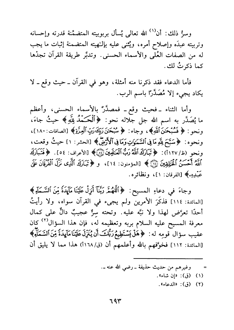 وسرُّ ذلك: أن (¬١) الله تعالى يُسأل بربوبيته المتضمِّنة قدرته وإحسانه وتربيته عبدَه وإصلاح أمره، ويُثنى عليه بإلهيته المتضمنة إثبات ما يجب له من الصفات العُلى والأسماء الحسنى. وتدبَّر طريقة القرآن تجدْها كما ذكرتُ لك.