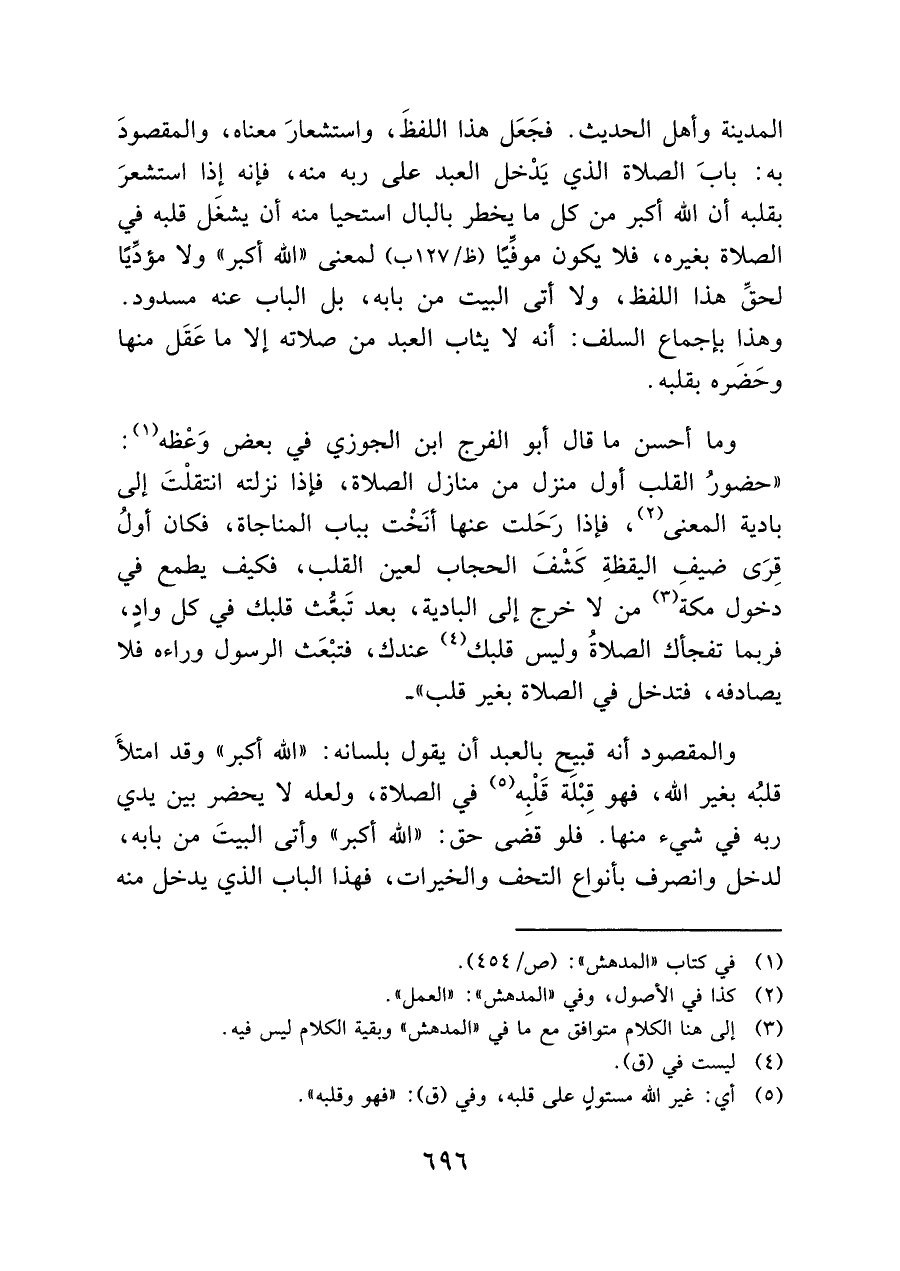 المدينة وأهل الحديث. فجَعَل هذا اللفظَ، واستشعارَ معناه، والمقصودَ به: بابَ الصلاة الذي يَدخل العبد على ربه منه، فإنه إذا استشعرَ بقلبه أن الله أكبر من كل ما يخطر بالبال استحيا منه أن يشغَل قلبه في الصلاة بغيره، فلا يكون موفَيًا (ظ/١٢٧ ب)، لمعنى "الله أكبر" ولا مؤدِّيًا لحقِّ هذا اللفظ، ولا أتى البيت من بابه، بل الباب عنه مسدود. وهذا بإجماع السلف: أنه لا يثاب العبد من صلاته إلا ما عَقَل منها وحَضره بقلبه.
